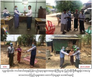 လူမှုဝန်ထမ်း၊ ကယ်ဆယ်ရေးနှင့်ပြန်လည်နေရာချထားရေးဝန်ကြီးဌာန၊ ဘေးအန္တရာယ်ဆိုင်ရာစီမံခန့်ခွဲမှုဦးစီးဌာန၊ ပြည်ခရိုင်ဦးစီးမှူးရုံးမှတာဝန်ရှိသူများသည် ပြည်ခရိုင်၊ ရွှေတောင်မြို့နယ်၊ ကျေးရွာအုပ်စု(၅)စု၊ (၁၈.၅.၂၀၂၀)ရက်နေ့(၁၇:၀၀)နာရီအချိန်တွင် လေပြင်းတိုက်ခတ်မှုကြောင့် အမိုးလန်နေအိမ်(၁၅)လုံးအတွက် အိမ်ဆောက်ပစ္စည်းဖိုးထောက်ပံ့ငွေ(၂၂၄၀၀၀)ကျပ်အား (၂၀.၅.၂၀၂၀)ရက်နေ့(၁၀:၀၀)နာရီအချိန်တွင် ဘေးသင့်ပြည်သူများထံ လက်ဝယ်အရောက် ထောက်ပံ့ပေးအပ်ခဲ့ကြောင်း သတင်းရရှိပါသည်။