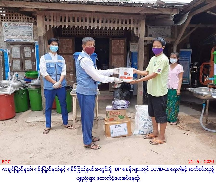 ယနေ့တွင် ကချင်ပြည်နယ်၊ ဗန်းမော်မြို့နယ်ရှိ ရောဘတ်ကျောင်းIDP စခန်းနှင့် နှစ်ခြင်း IDP စခန်းများသို့ သွားရောက်၍ လက်သန့်ဆေးရည်(၁,၂၇၈)ဗူး၊ ဆပ်ပြာ(၄,၀၀၅)ခဲ၊ ထုံးအိတ်(၂၀)အိတ်နှင့် အပူချိန်တိုင်း ကိရိယာ(၁)ခု၊ လက်ဆေးစင်(၁၆)ခု၊ အဝတ် Mask (၈,၀၁၀)ခု၊ Hand Speaker (၂)ခုနှင့် COVID-19 အသိပညာပေးအသံဖိုင် ထည့်သွင်းထားသော Memory Stick (၂)ခုတို့အား ထောက်ပံ့ခဲ့ပါသည်။