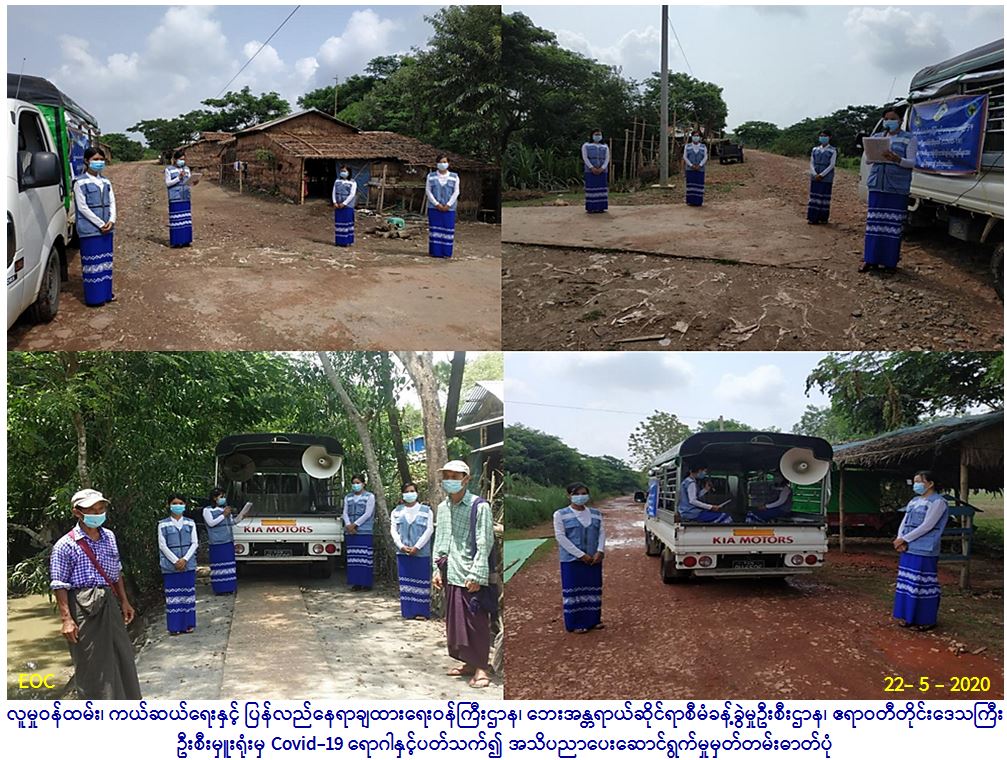 လူမှုဝန်ထမ်း၊ ကယ်ဆယ်ရေးနှင့် ပြန်လည်နေရာချထားရေး ဝန်ကြီးဌာန၊ ဘေးအန္တရာယ်ဆိုင်ရာစီမံခန့်ခွဲမှုဦးစီးဌာန၊ ဧရာဝတီတိုင်း ဒေသကြီးဦးစီးမှူးရုံးမှ တာဝန်ရှိသူများသည် (၂၂-၅-၂၀၂၀)ရက်နေ့ (၀၈:၀၀)နာရီအချိန်မှစ၍ ပုသိမ်ခရိုင်၊ ကန်ကြီးထောင့်မြို့နယ်၊ အမှတ် (၅)ရပ်ကွက်၊ အမှတ် (၆)ရပ်ကွက်၊ အမှတ် (၇)ရပ်ကွက် တို့၌လည်းကောင်း၊ လဟာကလူကျေးရွာအုပ်စု၊ လဟာကလူ ကျေးရွာ၊ စာဖြူစုကျေးရွာနှင့် ဘီလူးကျွန်းကျေးရွာတို့၌လည်းကောင်း၊ ကျူတန်းကျေးရွာအုပ်စု၊ အပြင်စာဖြူစုကျေးရွာ၌ လည်းကောင်း၊ အဓလောက်ကျေးရွာအုပ်စု၊ ကုန်းစုကျေးရွာနှင့် ရေလယ်ကွင်းကျေးရွတို့၌လည်းကောင်း၊ လတ်တလောနိုင်ငံ အသီးသီးတွင် ကူးစက်ပြန့်ပွားလျက်ရှိသော COVID-19 ကူးစက်ရောဂါနှင့်ပတ်သက်၍ သက်ဆိုင်ရာတာဝန်ရှိသူများနှင့်အတူ ကျေးရွာနေပြည်သူများအား အသိပညာပေးဟောပြောခြင်း များဆောင်ရွက်ခဲ့ပါကြောင်း သတင်းရရှိပါသည်။