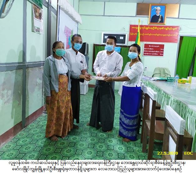 လူမှုဝန်ထမ်း၊ ကယ်ဆယ်ရေးနှင့် ပြန်လည်နေရာချထားရေးဝန်ကြီးဌာန၊ ဘေးအန္တရာယ်ဆိုင်ရာစီမံခန့်ခွဲမှုဦးစီး ဌာန၊ မော်လမြိုင်ကျွန်းမြို့နယ်ဦးစီးမှူးရုံးမှတာဝန်ရှိသူများသည် လပွတ္တာခရိုင်၊ မော်လမြိုင်ကျွန်းမြို့နယ်၊ ကျိုက်ပိကျေးရွာအုပ်စု၊ ကျိုက်ပိကျေးရွာ၊ အမှတ်(၃)ရပ်ကွက်၌ (၂၁-၅-၂၀၂၀) ရက်နေ့တွင်ဖြစ်ပွားခဲ့သော လေပြင်းတိုက်ခတ်မှုကြောင့် တစ်စိတ်တစ်ပိုင်းပျက်စီးနေအိမ်(၁)လုံး၊ အိမ်ထောင်စု (၁)စုမှ လူဦးရေ (၂) ဦး ဘေးသင့်ခဲ့ရာ အဆိုပါဘေးသင့်ပြည်သူများအတွက် အိမ်ဆောက်ပစ္စည်းဖိုးထောက်ပံ့ငွေ (၅၀,၀၀၀/-) ကျပ်နှင့် ဆန်ရိက္ခာ (၇) ရက်စာဖိုးထောက်ပံ့ငွေ (၄,၂၀၀/-) ကျပ်တို့ကို (၂၂-၅-၂၀၂၀) ရက်နေ့၊ (၁၂:၀၀) နာရီအချိန်တွင် မော်လမြိုင်ကျွန်းမြို့နယ်အထွေထွေအုပ်ချုပ်ရေးဦးစီးဌာန၌ မြို့နယ်အုပ်ချုပ်ရေးမှူး၊ ကျေးရွာအုပ်ချုပ်ရေးမှူး တို့နှင့်အတူ ပြည်သူများထံသို့ ထောက်ပံ့ပေးအပ်ခဲ့ပါကြောင်း သတင်းရရှိပါသည်။
