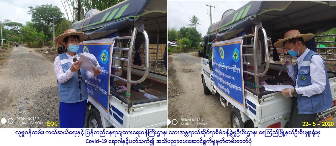 လူမှုဝန်ထမ်း၊ ကယ်ဆယ်ရေးနှင့် ပြန်လည်နေရာချထားရေး ဝန်ကြီးဌာန၊ ဘေးအန္တရာယ်ဆိုင်ရာစီမံခန့်ခွဲမှုဦးစီးဌာန၊ ရေကြည် မြို့နယ်ဦးစီးမှူးရုံးမှ တာဝန်ရှိသူများသည် (၂၂.၅.၂၀၂၀)ရက်နေ့တွင် ရေကြည်မြို့နယ်၊ ညောင်ငူကျေးရွာအုပ်စု၊ ညောင်ငူကျေးရွာ၊ ရုပ်သေးကုန်းကျေးရွာ၊ အညာတန်းကျေးရွာ၊ ကျွန်းတော ကုန်းကျေးရွာနှင့် ကိုင်းငူကျေးရွာတို့တွင် (၀၈:၀၀)နာရီမှ (၁၂:၀၀)နာရီ အထိ လတ်တလောနိုင်ငံအသီးသီးတွင် ကူးစက်ပျံနှံ့လျက်ရှိသော Covid-19 ကူးစက်ရောဂါနှင့်ပက်သက်ပြီး ဆောင်ရန်/ရှောင်ရန် များကို ကျေးရွာ/ရပ်ကွက်နေပြည်သူတို့အား အသိပညာပေးဟောပြောဆောင်ရွက်ခဲ့ပါကြောင်း သတင်းရရှိပါသည်။