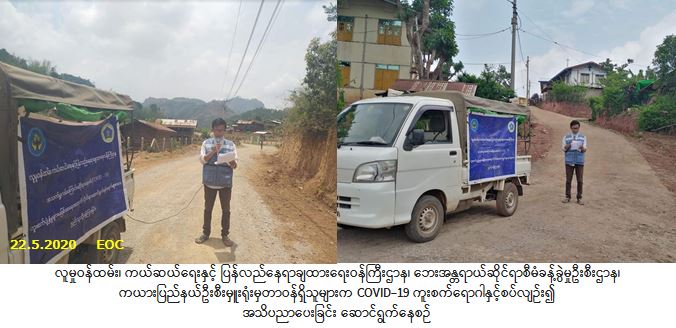 လူမှုဝန်ထမ်း၊ ကယ်ဆယ်ရေးနှင့် ပြန်လည်နေရာချထားရေးဝန်ကြီးဌာန၊ ဘေးအန္တရာယ်ဆိုင်ရာစီမံခန့်ခွဲမှုဦးစီး ဌာန၊ ကယားပြည်နယ်ဦးစီးမှူးရုံးမှတာဝန်ရှိသူများသည် (၂၂-၅-၂၀၂၀) ရက်နေ့တွင် ဒီးမော့ဆိုမြို့နယ်၊ လိုဘာခိုကျေးရွာအုပ်စု၊ လိုဘာခိုကျေးရွာ၊ ဟိုဝမ်ကျေးရွာအုပ်စု၊ ဟိုဝမ်အထက်ကျေးရွာနှင့် ဟိုဝမ်အောက်ကျေးရွာ၊ ဝါဘန်းပလို့ကျေးရွာအုပ်စု၊ ထီးလသူးခိုကျေးရွာများ၌ COVID-19 ကူးစက်ရောဂါနှင့်စပ်လျဉ်း၍ ဆောင်ရန်/ရှောင်ရန်အချက်များကို အသိပညာပေးနှိုးဆော်ခဲ့ပါကြောင်း သတင်းရရှိပါသည်။