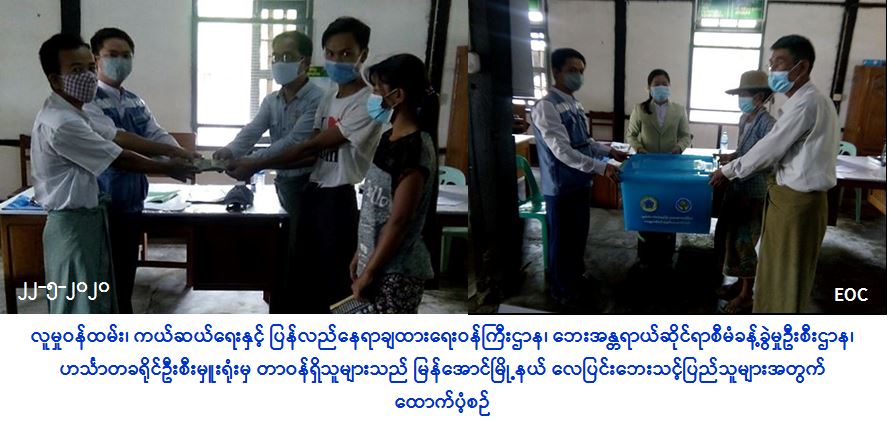 လူမှုဝန်ထမ်း၊ ကယ်ဆယ်ရေးနှင့် ပြန်လည်နေရာချထားရေးဝန်ကြီးဌာန၊ ဘေးအန္တရာယ်ဆိုင်ရာစီမံခန့်ခွဲမှုဦးစီးဌာန၊ ဟင်္သာတခရိုင်ဦးစီးမှူးရုံးမှ တာဝန်ရှိသူများသည် မြန်အောင်မြို့နယ်၊ ကနောင်မြို့၊ ရိုက်စုရပ်ကွက်၌ (၂၁-၅-၂၀၂၀) ရက်နေ့တွင် ဖြစ်ပွားခဲ့သော လေပြင်းတိုက်ခတ်မှုကြောင့် ပြိုကျပျက်စီးခဲ့သော အိမ်ခြေ(၁)လုံး၊ ၎င်းအိမ်ထောင်စု (၁)စုရှိ လူဦးရေ(၁)ဦးတို့အတွက် ကယ်ဆယ်ရေးပစ္စည်း (၁၆)မျိုး၊ အိမ်ဆောက်ပစ္စည်းဖိုးထောက်ပံ့ငွေ (၁၀၀၀၀၀) ကျပ်၊ ဆန်ရိက္ခာဖိုးငွေ (၂၁၀၀) ကျပ်၊ စုစုပေါင်းထောက်ပံ့ငွေ (၁၀၂၁၀၀) ကျပ်တိတိကိုလည်းကောင်း၊ မြန်အောင်မြို့နယ်၊ ကျွဲတဲကုန်းအုပ်စု၊ ဒေါင့်ကြီးရွာ၌ (၂၁-၅-၂၀၂၀) ရက်နေ့တွင် ဖြစ်ပွားခဲ့သော လေပြင်းတိုက်ခတ်မှုကြောင့် အမိုးလန်ပျက်စီးခဲ့သော အိမ်ခြေ(၂)လုံး၊ ၎င်းအိမ်ထောင်စု (၂)စုရှိ လူဦးရေ(၁၀)ဦးတို့အတွက် အိမ်ဆောက်ပစ္စည်းဖိုးထောက်ပံ့ငွေ (၆၀၀၀၀) ကျပ်၊ ဆန်ရိက္ခာဖိုးငွေ (၂၁၀၀၀) ကျပ်၊ စုစုပေါင်းထောက်ပံ့ငွေ (၈၁၀၀၀) ကျပ်တိတိကိုလည်းကောင်း၊ မြန်အောင်မြို့နယ်၊ မြို့မတဲကြီးကုန်းအုပ်စု၌ (၂၀-၅-၂၀၂၀) ရက်နေ့တွင် ဖြစ်ပွားခဲ့သော လေပြင်းတိုက်ခတ်မှုကြောင့် အမိုးလန်ပျက်စီးခဲ့သော အိမ်ခြေ(၂)လုံး၊ ၎င်းအိမ်ထောင်စု (၂)စုရှိ လူဦးရေ(၆)ဦးတို့အတွက် အိမ်ဆောက်ပစ္စည်းဖိုးထောက်ပံ့ငွေ (၆၀၀၀၀) ကျပ်၊ ဆန်ရိက္ခာဖိုးငွေ (၁၂၆၀၀) ကျပ်၊ စုစုပေါင်းထောက်ပံ့ငွေ (၇၂၆၀၀) ကျပ်တိတိကိုလည်းကောင်း (၂၂-၅-၂၀၂၀) ရက်နေ့၊ (၁၂:၀၀) နာရီအချိန်တွင် မြန်အောင်မြို့နယ်၊ အထွေထွေအုပ်ချုပ်ရေးဦးစီးဌာန၌ မြို့နယ်ထွေ/အုပ်မှ တာဝန်ရှိသူများနှင့်အတူ ဘေးသင့်ပြည်သူများထံ ထောက်ပံ့ပေးအပ်ခဲ့ကြောင်း သတင်းရရှိပါသည်။