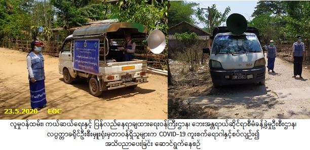 လူမှုဝန်ထမ်း၊ ကယ်ဆယ်ရေးနှင့် ပြန်လည်နေရာချထားရေးဝန်ကြီးဌာန၊ ဘေးအန္တရာယ်ဆိုင်ရာစီမံခန့်ခွဲမှုဦးစီး ဌာန၊ လပွတ္တာခရိုင်ဦးစီးမှူးရုံးမှတာဝန်ရှိသူများသည် (၂၃-၅-၂၀၂၀) ရက်နေ့၊ (၀၈:၀၀) နာရီအချိန်မှ (၁၂:၀၀) နာရီအချိန်အထိ လပွတ္တာမြို့နယ်၊ မောင်းဒီးကျေးရွာအုပ်စုအတွင်းရှိ ကျောက်အိုင်ကျေးရွာ၊ စမ်းကြီးကုန်းကျေးရွာ၊ ကျွန်းကလေးကျေးရွာ၊ ဂေါင်းတိုကျေးရွာနှင့် ချောင်းဖျားကျေးရွာတို့၌ COVID-19 ကူးစက်ရောဂါနှင့်စပ်လျဉ်း၍ ကျန်းမာရေးနှင့်အားကစား၀န်ကြီးဌာနမှ ထုတ်ပြန်ထားသည့် အသိပေးကြေညာချက်များကို Loud Speaker ဖြင့် လှည့်လည်အသိပညာပေးနှိုးဆော်ခဲ့ပါကြောင်း သတင်းရရှိပါသည်။