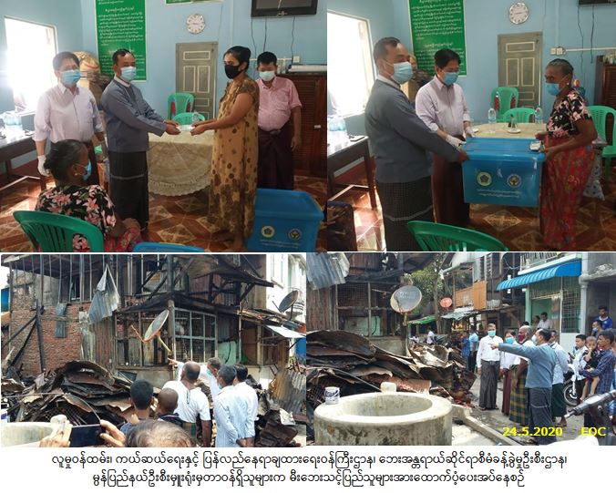 လူမှုဝန်ထမ်း၊ ကယ်ဆယ်ရေးနှင့် ပြန်လည်နေရာချထားရေးဝန်ကြီးဌာန၊ ဘေးအန္တရာယ်ဆိုင်ရာစီမံခန့်ခွဲမှုဦးစီး ဌာန၊ မွန်ပြည်နယ်ဦးစီးမှူးရုံးမှတာဝန်ရှိသူများသည် မွန်ပြည်နယ်အစိုးရအဖွဲ့ဝင် လူမှုရေးဝန်ကြီးနှင့်အတူ မော်လမြိုင်မြို့၊ မန္တလေးရပ်ကွက်၊ မဟာမိတ်လမ်း၌ (၂၃-၅-၂၀၂၀) ရက်နေ့၊ (၁၈:၅၀)နာရီအချိန်တွင် ဖြစ်ပွားခဲ့သောမီးဘေးကြောင့် ပျက်စီးနေအိမ် (၄) လုံးအတွက် အိမ်ဆောက်ပစ္စည်းဖိုးထောက်ပံ့ငွေ (၆၃၇,၀၀၀/-) ကျပ်၊ ကယ်ဆယ်ရေးပစ္စည်း (၁၆) မျိုး အိမ်ထောင်စု (၃) စုစာနှင့် ဘေးသင့်လူဦးရေ (၁၈)ဦးအတွက် ဆန်ရိက္ခာ(၇)ရက်စာဖိုးထောက်ပံ့ငွေ (၃၇,၈၀၀/-) ကျပ်တို့ကို (၂၄-၅-၂၀၂၀)ရက်နေ့၊ (၀၉:၀၀)နာရီအချိန်တွင် ထောက်ပံ့ပေးအပ်ခဲ့ပါကြောင်း သတင်းရရှိပါသည်။