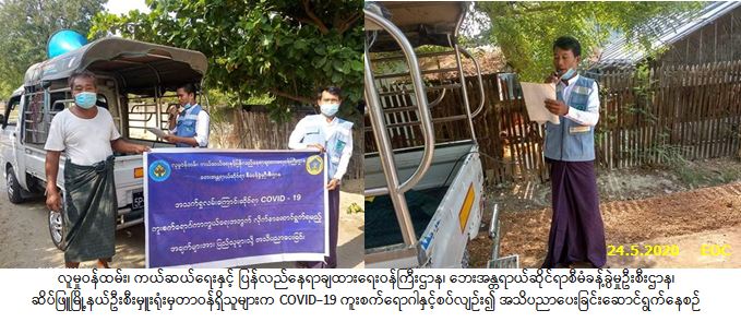 လူမှုဝန်ထမ်း၊ ကယ်ဆယ်ရေးနှင့် ပြန်လည်နေရာချထားရေးဝန်ကြီးဌာန၊ ဘေးအန္တရာယ်ဆိုင်ရာစီမံခန့်ခွဲမှုဦးစီး ဌာန၊ ဆိပ်ဖြူမြို့နယ်ဦးစီးမှူးရုံးမှတာဝန်ရှိသူများသည် (၂၄-၅-၂၀၂၀) ရက်နေ့၊ (၀၇:၀၀) နာရီအချိန်မှ (၁၀:၀၀) နာရီအချိန်အထိ ပခုက္ကူခရိုင်၊ ဆိပ်ဖြူမြို့နယ်အတွင်းရှိ မြို့ပေါ်ရပ်ကွက်များဖြစ်သည့် ယောဝရပ်ကွက်၊ အလယ်ပိုင်းရပ်ကွက်၊ အနောက်ပိုင်းရပ်ကွက်နှင့် ရွာသစ်ရပ်ကွက်တို့၌ COVID-19 ကူးစက်ရောဂါနှင့်စပ်လျဉ်း၍ ဆောင်ရန်/ရှောင်ရန်အချက်များကို အသိပညာပေးနှိုးဆော်ခဲ့ပါကြောင်း သတင်းရရှိပါသည်။