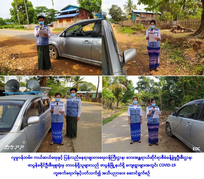 လူမှုဝန်ထမ်း၊ ကယ်ဆယ်ရေးနှင့် ပြန်လည်နေရာချထားရေးဝန်ကြီးဌာန၊ ဘေးအန္တရာယ်ဆိုင်ရာစီမံခန့်ခွဲမှုဦးစီးဌာန၊ ဖာပွန်ခရိုင်ဦးစီးမှူးရုံးမှ တာဝန်ရှိသူများသည် (၂၅-၅-၂၀၂၀) ရက်နေ့၊ နံနက် (၀၈:၀၀) နာရီမှ (၁၁:၀၀) နာရီအချိန်ထိ ဖာပွန်မြို့နယ်အတွင်းရှိ နို့ဖောထီးကျေးရွာ၊ ညာပေါင်ခီးကျေးရွာနှင့် ဖာလုံရွာလေးကျေးရွာများအတွင်း COVID-19 ရောဂါပျံ့နှံ့မှုများမဖြစ်ပွားစေရန် အသံချဲ့စက်ဖြင့် အသိပညာပေးဟောပြောခြင်းများ ဆောင်ရွက်ခဲ့ကြောင်း သတင်းရရှိပါသည်။
