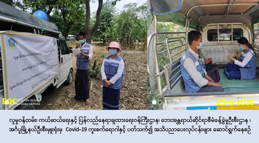 လူမှုဝန်ထမ်း၊ ကယ်ဆယ်ရေးနှင့် ပြန်လည်နေရာချထားရေးဝန်ကြီးဌာန၊ ဘေးအန္တရာယ်ဆိုင်ရာ စီမံခန့်ခွဲမှုဦးစီးဌာန၊ အင်္ဂပူမြို့နယ်ဦးစီးမှူးရုံးမှ တာဝန်ရှိသူများသည် အထွေထွေအုပ်ချုပ်ရေး ဦးစီးဌာနနှင့် ပူးပေါင်း၍ (၂၅-၅-၂၀၂၀) ရက်နေ့တွင် တလိုင်းကွင်းကျေးရွာအုပ်စုရှိ ဝက်ကုန်း ကျေးရွာ၊ သရက်ကုန်းကျေးရွာ၊ ကံကြိုးကျေးရွာ၊ ကနစိုကုန်းကျေးရွာ၊ သပြေတုံးလဲကျေးရွာများ အတွင်းရှိ ပြည်သူများအား Covid- 19 ကာကွယ်၊ တားဆီး၊ ထိန်းချုပ်၊ ကုသရေးဆိုင်ရာ အသိပညာပေး ဆောင်ရန်/ရှောင်ရန် အချက်အလက်များကို ပြည်သူများ အလွယ်တကူသိရှိ လိုက်နာနိုင်ရေးအတွက် လှည့်လည်၍ အသံချဲ့စက်ဖြင့် အသိပေးနှိုးဆော်ခြင်းလုပ်ငန်းများအား ဆောင်ရွက်ခဲ့ကြောင်း သတင်းရရှိပါသည်။