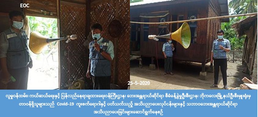 လူမှုဝန်ထမ်း၊ ကယ်ဆယ်ရေးနှင့် ပြန်လည်နေရာချထားရေးဝန်ကြီးဌာန၊ ဘေးအန္တရာယ်ဆိုင်ရာ စီမံခန့်ခွဲ မှုဦးစီးဌာန၊ ဘိုကလေးမြိုနယ်ဦးစီးမှူးရုံးမှ တာဝန်ရှိသူများသည် (၂၅-၅-၂၀၂၀) ရက်နေ့တွင် (၁၀:၀၀) နာရီ၌ ဘိုကလေးမြို့နယ်၊ ကုလားအုန်းပင်စုကျေးရွာအုပ်စု၊ တရုတ်အိမ်ကျေးရွာတွင်လည်းကောင်း၊ (၁၁:၀၀) နာရီ၌ တုံးလဲကျေးရွာတွင်လည်းကောင်း၊ (၁၂:၀၀) နာရီ၌ အေးစုကျေးရွာတွင်လည်းကောင်း၊ (၁၃:၀၀) နာရီ၌ ဘောက်စုကျေးရွာတွင် လည်းကောင်း၊ (၁၅:၀၀) နာရီ၌ စာဖြူစုကျေးရွာတွင် လည်း ကောင်း (Covid-19) အသက်ရှူလမ်းကြောင်း ဆိုင်ရာရောဂါနှင့် ပတ်သက်၍ ကျန်းမာရေးနှင့် အားကစား ဝန်ကြီးဌာနမှ ထုတ်ပြန်ထားသည့် အသိပေးကြေညာချက်များ၊ သဘာဝဘေးအန္တရာယ်ဆိုင်ရာ အသိပညာ ပေးမှုများကို အများပြည်သူများသိရှိလိုက်နာရန်ကွင်းဆင်း၍ အသံချဲ့စက်များဖြင့် လှည့်လှည်၍ အသိ ပညာပေးခြင်းများ ပြုလုပ်ဆောင်ရွက်ခဲ့ကြောင်း သိရှိရပါသည်။