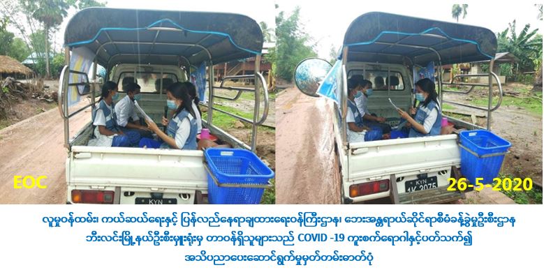 လူမှုဝန်ထမ်း၊ ကယ်ဆယ်ရေးနှင့် ပြန်လည်နေရာချထားရေးဝန်ကြီးဌာန၊ ဘေးအန္တရာယ်ဆိုင်ရာစီမံ ခန့်ခွဲမှုဦးစီးဌာန၊ မွန်ပြည်နယ်၊ သထုံခရိုင်၊ ဘီးလင်းမြို့နယ်ဦးစီးမှူးရုံးမှ တာဝန်ရှိသူများသည် (၂၆-၅-၂၀၂၀) ရက်နေ့၊ (၀၇:၃၀)နာရီအချိန်မှ စတင်ပြီး ဘီးလင်းမြို့နယ်၊ ရွှေရောင်ပြကျေးရွာအုပ်စု အတွင်းရှိ ရွှေရောင်ပြကျေးရွာ၊ အဝင်းကြီးကျေးရွာ၊ ဇီးဝင်းကျေးရွာ၊ မရမ်းကုန်းလေးကျေးရွာ၊ မရမ်းကုန်းကြီးကျေးရွာ၊ ခလောင်းအင်းကျေးရွာနှင့် မိကျောင်းအင်းကျေးရွာတို့တွင် COVID -19 ကူးစက်ရောဂါနှင့်ပတ်သက်ပြီး ဆောင်ရန်/ရှောင်ရန် တို့ကို ကျေးရွာအုပ်ချုပ်ရေးမှူးများနှင့်အတူ ပူးပေါင်း၍ ဆောင်ရွက်လျက်ရှိကြောင်း သတင်းရရှိပါသည်။