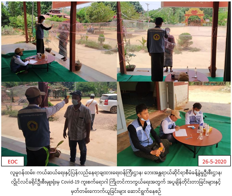 လူမှုဝန်ထမ်း၊ ကယ်ဆယ်ရေးနှင့်ပြန်လည်နေရာချထားရေးဝန်ကြီးဌာန၊ ဘေးအန္တရာယ်ဆိုင်ရာစီမံခန့်ခွဲမှုဦးစီးဌာန၊ လွိုင်လင်ခရိုင်ဦးစီးမှူးရုံးမှ (၂၆-၅-၂၀၂၀)ရက်နေ့ (၈း၀၀)နာရီအချိန်မှ (၄း၀၀)နာရီအချိန်ထိ လွိုင်လင်မြို့၊ ပန်ခေါက်ဝိုးကျေးရွာ Covid-19စစ်ဆေးရေးဂိတ်၌ ကျိုင်းတုံ – တောင်ကြီး ပြည်ထောင်စု ကားလမ်းမပေါရှိ ခရီးသွားပြည်သူများအား အသက်ရှူလမ်းကြောင်းဆိုင်ရာရောဂါ (COVID-19 ) ဆောင်ရန်ရှောင်ရန်များ အသိပညာပေးခြင်း၊ ကိုယ်အပူချိန်တိုင်းတာခြင်း၊ ခရီးသွားရာဇဝင် မှတ်တမ်းယူခြင်းနှင့် လက်ကမ်းစာစောင်ဖြန့်ဝေခြင်းများ ဆောင်ရွက်ခဲ့ကြောင်း သတင်းရရှိပါသည်။