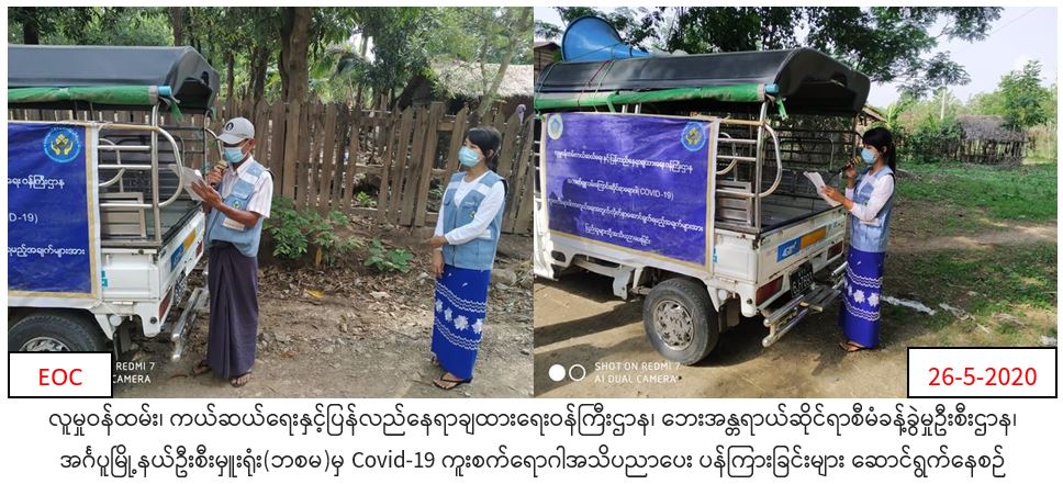 လူမှုဝန်ထမ်း၊ ကယ်ဆယ်ရေးနှင့်ပြန်လည်နေရာချထားရေးဝန်ကြီးဌာန၊ ဘေးအန္တရာယ်ဆိုင်ရာစီမံခန့်ခွဲမှုဦးစီးဌာန၊ အင်္ဂပူမြို့နယ်ဦးစီးမှူးရုံးမှ တာဝန်ရှိသူများသည် အထွေထွေအုပ်ချုပ်ရေးဦးစီးဌာနနှင့်ပူးပေါင်း၍ (၂၆-၅-၂၀၂၀) ရက်နေ့တွင် ထန်းပင်ကန်ကျေးရွာအုပ်စုရှိ တာနားကျေးရွာ၊ ထန်းပင်ကန်ကျေးရွာ၊ ရွှေလှေကွင်းကျေးရွာနှင့်ဆုံ ကုန်းကျေးရွာအုပ်စုရှိ ရွှေဥဒေါင်းကျေးရွာ၊ တံတားဦးကျေးရွာ၊ ညောင်စုကျေးရွာများ၌ Covid-19 ရောဂါနှင့်ပတ်သက်၍ ကာကွယ်၊ တားဆီး၊ ထိန်းချုပ်၊ ကုသရေးဆိုင်ရာ အသိပညာပေး ဆောင်ရန်ရှောင်ရန် အချက်အလက်များကို ပြည်သူများ အလွယ်တကူသိရှိ လိုက်နာနိုင်ရေးအတွက်လှည့်လည်၍ အသံချဲ့စက်ဖြင့် အသိပေးနှိုးဆော်ခြင်းလုပ်ငန်းများအား ဆောင်ရွက်ခဲ့ကြောင်း သတင်းရရှိပါသည်။