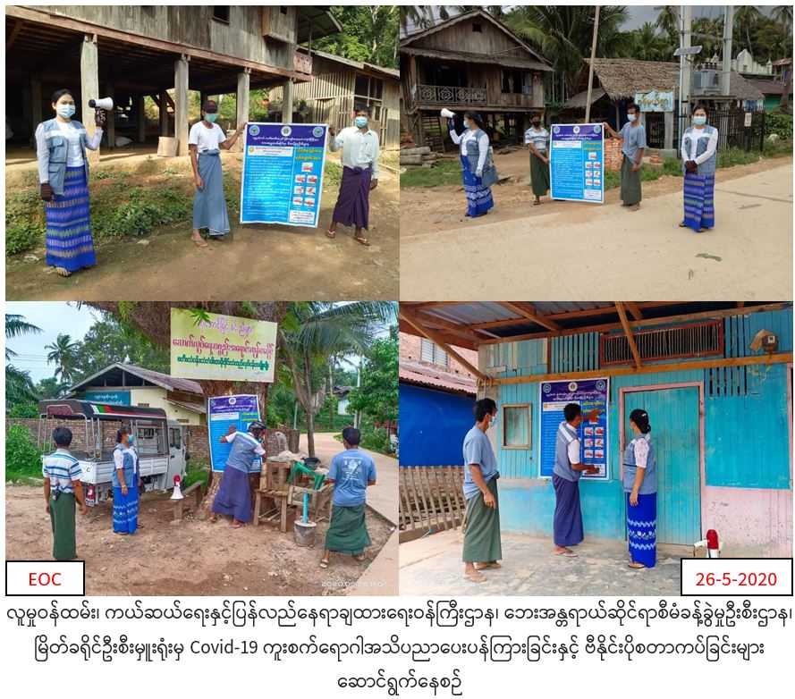 လူမှုဝန်ထမ်း၊ ကယ်ဆယ်ရေးနှင့်ပြန်လည်နေရာချထားရေးဝန်ကြီးဌာန၊ ဘေးအန္တရာယ်ဆိုင်ရာစီမံခန့်ခွဲမှုဦးစီးဌာန၊ မြိတ်ခရိုင်ဦးစီးမှူးရုံးမှ (၂၆.၅.၂၀၂၀)နေ့ မြိတ်မြို့နယ် ပင်းအိုအုပ်စု၊ လက်ခုပ်တောင်၊ ရှင်မြတ်တောင်၊ ဘန်ချင်းတောင်၊ ပင်းအိုအနောက်၊ ပင်းအိုအရှေ့နှင့် သဘွတ်အုပ်စြ သဘွတ်၊ ဝန်မယ်၊ ပရည်တောင်ကျေးရွာများတွင် COVID19 ရောဂါကူးစက်ပြန့်ပွားမှုမရှိစေရေး အသိပညာပေးဆော်သြခြင်း၊ ဗီနိုင်းပိုစတာကပ်ခြင်းတို့ကို ရပ်ကျေးအဖွဲ့နှင့်ပူးပေါင်းဆောင်ရွက်ခဲ့ကြောင်း သတင်းရရှိပါသည်။
