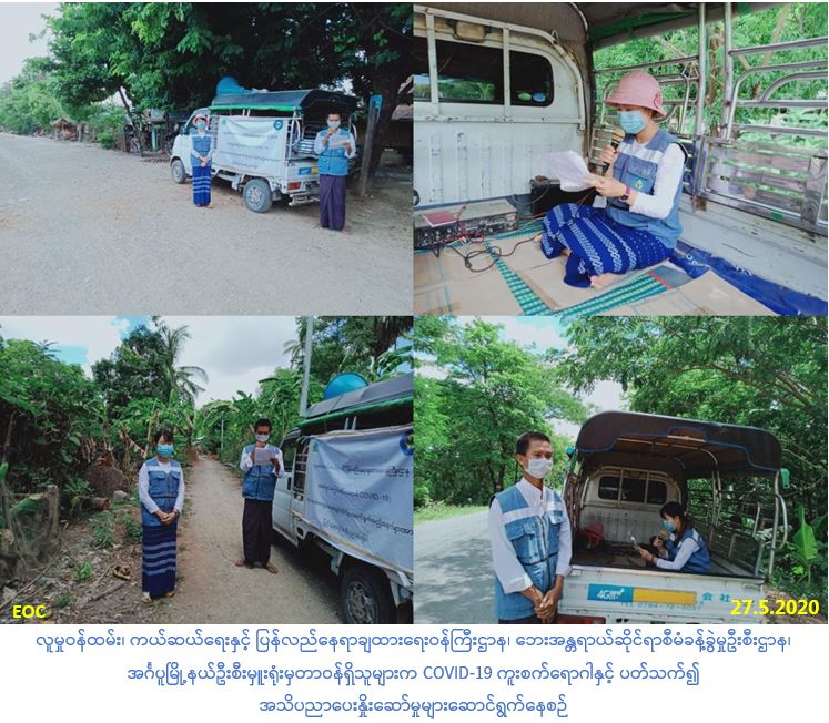 လူမှုဝန်ထမ်း၊ ကယ်ဆယ်ရေးနှင့် ပြန်လည်နေရာချထားရေးဝန်ကြီးဌာန၊ ဘေးအန္တရာယ်ဆိုင်ရာစီမံခန့်ခွဲမှုဦးစီးဌာန၊ အင်္ဂပူမြို့နယ်ဦးစီးမှူးရုံးမှတာဝန်ရှိသူများသည် အထွေထွေအုပ်ချုပ်ရေးဦးစီး ဌာနနှင့်ပူးပေါင်း၍ (၂၇-၅-၂၀၂၀) ရက်နေ့တွင် ခြောက်ရွာကျေးရွာအုပ်စုရှိ ခြောက်ရွာကျေးရွာ၊ ကျုံပိုကျေးရွာ၊ ဒေါင့်ကြီးကျေးရွာနှင့် ကျီးကြီးကျေးရွာအုပ်စုရှိ ကျီးကြီးကျေးရွာ၊ ဒရင်ကောက်ကျေးရွာ၊ ကျောင်းစုကျေးရွာ၊ တဲကြီးစုကျေးရွာများ၌ Covid-19 ကူးစက်ရောဂါနှင့် ပတ်သက်၍ ကာကွယ်၊ တားဆီး၊ ထိန်းချုပ်၊ ကုသရေးဆိုင်ရာ အသိပညာပေး ဆောင်ရန်ရှောင်ရန်အချက်အလက်များကို ပြည်သူများအလွယ်တကူသိရှိလိုက်နာနိုင်ရေး အတွက်လှည့်လည်၍ အသံချဲ့စက်ဖြင့် အသိပေးနှိုးဆော်မှုများဆောင်ရွက်ခဲ့ပါကြောင်း သတင်း ရရှိပါသည်။