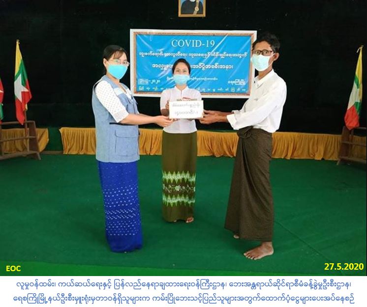 လူမှုဝန်ထမ်း၊ ကယ်ဆယ်ရေးနှင့် ပြန်လည်နေရာချထားရေးဝန်ကြီးဌာန၊ ဘေးအန္တရာယ်ဆိုင်ရာစီမံခန့်ခွဲမှုဦးစီးဌာန၊ ရေစကြိုမြို့နယ်ဦးစီးမှူးရုံးမှတာဝန်ရှိသူများသည် ရေစကြိုမြို့နယ်၊ ငါးလန် ကျေးရွာအုပ်စု၊ ငါးလန်ကျေးရွာတွင်(၂၆-၅-၂၀၂၀)ရက်နေ့၊ (၁၀:၀၀)အချိန်၌ ဧရာဝတီမြစ်ရေ တိုက်စား ကမ်းပါးပြိုကျမှုကြောင့် ကြိုတင်ဖျက်သိမ်း ပြောင်းရွှေ့ခြင်းများ ဆောင်ရွက်ခဲ့ကြရာ ကြိုတင်ဖျက်သိမ်းပြောင်းရွှေ့လူနေအိမ်(၄)လုံး၊ အိမ်ထောင်စု(၅)စု၊ လူဦးရေ(၁၅)ဦးတို့အတွက် အိမ်ဆောက်ပစ္စည်းဖိုးထောက်ပံ့ငွေ(၄၀၀,၀၀ဝ/-)ကျပ်၊ ဆန်ရိက္ခာဖိုးထောက်ပံ့ငွေ(၃၁,၅၀ဝ/-) ကျပ်၊ စုစုပေါင်းထောက်ပံ့ငွေ(၄၃၁,၅၀ဝ/-)ကျပ်အား (၂၇-၅-၂၀၂၀)ရက်နေ့၊ (၁၁:၀၀)အချိန်တွင် ရေစကြိုမြို့နယ်အထွေထွေအုပ်ချုပ်ရေးဦးစီးဌာန၊ အစည်းအဝေးခန်းမ၌ မြို့နယ်အထွေထွေအုပ် ချုပ်ရေးရုံးမှတာဝန်ရှိသူနှင့်အတူ ကျေးရွာအုပ်ချုပ်ရေးမှူးလက်ဝယ်အရောက် ထောက်ပံ့ပေးအပ်ခဲ့ပါကြောင်း သတင်းရရှိပါသည်။