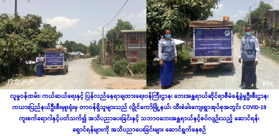 လူမှုဝန်ထမ်း၊ ကယ်ဆယ်ရေးနှင့် ပြန်လည်နေရာချထားရေးဝန်ကြီးဌာန၊ ဘေးအန္တရာယ်ဆိုင်ရာ စီမံခန့်ခွဲမှုဦးစီးဌာန၊ ကယားပြည်နယ်ဦးစီးမှူးရုံးမှ တာဝန်ရှိသူများသည် (၂၇-၅-၂၀၂၀) ရက်နေ့တွင် လွိုင်ကော်မြို့နယ်၊ ထီးစဲခါးကျေးရွာအုပ်စု၊ နာကွယ်ကျေးရွာ၊ မိုက်တိန်းကျေးရွာဆုံကျေးရွာနှင့် ဘုရားဖြူကျေးရွာများရှိ ပြည်သူများအား COVID-19 ကူးစက်ရောဂါ ပျံ့နှံ့မှုမဖြစ်ပွားစေရန် သိရှိလိုက်နာရန်အချက်များနှင့် သဘာဝဘေးအန္တရာယ်နှင့်စပ်လျဉ်းသည့် ဆောင်ရန်၊ ရှောင်ရန်များကို အသိပညာပေး ဆောင်ရွက်ခဲ့ကြောင်း သတင်းရရှိပါသည်။