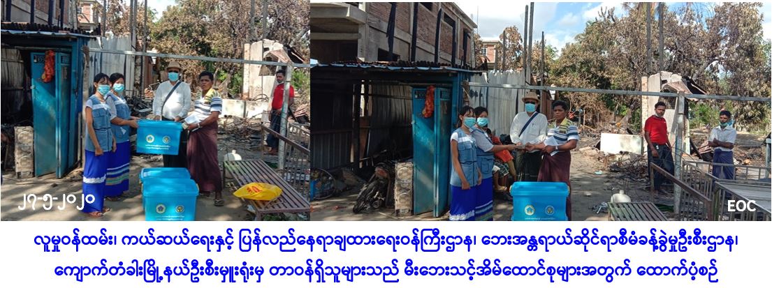 လူမှုဝန်ထမ်း၊ ကယ်ဆယ်ရေးနှင့် ပြန်လည်နေရာချထားရေးဝန်ကြီးဌာန၊ ဘေးအန္တရာယ်ဆိုင်ရာ စီမံခန့်ခွဲမှုဦးစီးဌာန၊ ကျောက်တံခါးမြို့နယ်ဦးစီးမှူးရုံးမှ တာဝန်ရှိသူများသည် ပဲခူးခရိုင်၊ ကျောက်တံခါးမြို့နယ်၊ ကွင်းနောက်ရပ်ကွက်၊ နီလာလမ်း၌ (၂၆-၅-၂၀၂၀) ရက်နေ့တွင် ဖြစ်ပွားခဲ့သော မီးဘေးကြောင့် ပျက်စီးခဲ့သည့်နေအိမ် (၁)လုံးအတွက် အိမ်ဆောက်ပစ္စည်းဖိုးထောက်ပံ့ငွေ(၂၀၀၀၀၀)ကျပ်၊ အိမ်ထောင်စု(၃)စုရှိ လူဦးရေ(၂၁)ဦးအတွက် ဆန်ရိက္ခာဖိုးထောက်ပံ့ငွေ(၄၄၁၀၀)ကျပ်၊ ကယ်ဆယ်ရေးပစ္စည်း(၁၉)မျိုး(ပလပ်စတစ်ပုံးအပါ)(၃)အိမ်ထောင်စာတို့အား (၂၇-၅-၂၀၂၀)ရက်နေ့၊ နေ့လည်(၀၂:၀၀)နာရီအချိန်တွင် သက်ဆိုင်ရာရပ်ကွက်အုပ်ချုပ်ရေးမှူးနှင့်အတူ ပြည်သူလက်၀ယ်အရောက် သွားရောက်ထောက်ပံ့ပေးအပ်ခဲ့ကြောင်း သတင်းရရှိပါသည်။