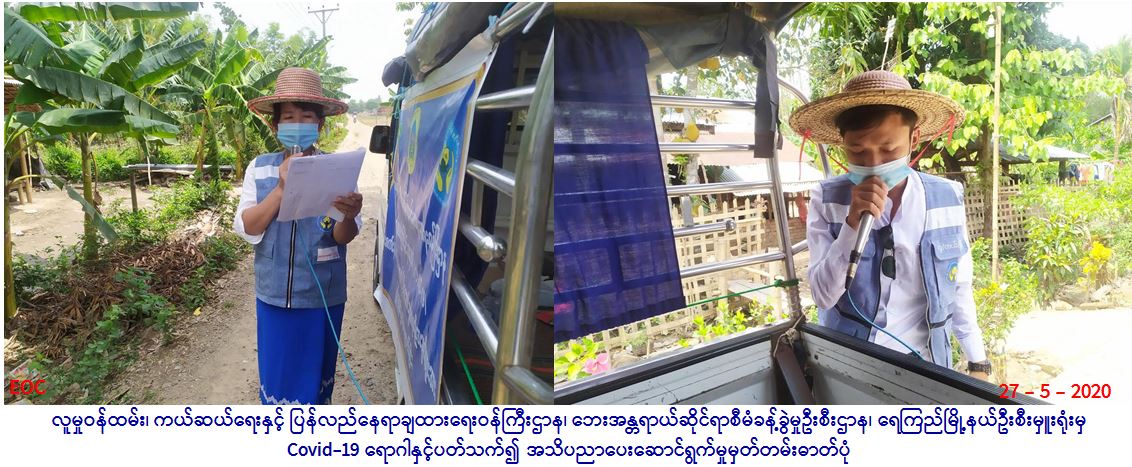 လူမှုဝန်ထမ်း၊ ကယ်ဆယ်ရေးနှင့် ပြန်လည်နေရာချထားရေး ဝန်ကြီးဌာန၊ ဘေးအန္တရာယ်ဆိုင်ရာစီမံခန့်ခွဲမှုဦးစီးဌာန၊ ရေကြည် မြို့နယ်ဦးစီးမှူးရုံးမှ တာဝန်ရှိသူများသည် (၂၇.၅.၂၀၂၀) ရက်နေ့တွင် ရေကြည်မြို့နယ်၊ သင်္ကန်းဒေါင့်ကျေးရွာအုပ်စု၊ သင်္ကန်းဒေါင့် ကျေးရွာ၊ ညောင်ဝိုင်းစုကျေးရွာ၊ တောင်စုကျေးရွာ၊ ကညင်လေးပင်ကျေးရွာ၊ သုံးအိမ်တန်းကျေးရွာ၊ သံဒင်းချောင်ကျေးရွာ၊ နုံးကနိုင် ကျေးရွာ၊ သရက်ပင်လှကျေးရွာ၊ ငါးရံ့ချောင်းကျေးရွာ၊ သင်္ကန်းဒေါင့် (အထက်ပိုင်း)ကျေးရွာ၊ ကုံးစုကျေးရွာ၊ ကွင်း(လယ်စု)ကျေးရွာ တို့တွင် (၀၈:၀၀) နာရီမှ (၁၇:၀၀)နာရီအထိ လတ်တလောနိုင်ငံအသီးသီးတွင် ကူးစက်ပျံနှံ့လျှက်ရှိသော Covid-19 ကူးစက်ရောဂါ နှင့် ပက်သက်ပြီး ဆောင်ရန်/ရှောင်ရန်များကို ကျေးရွာ/ရပ်ကွက်နေပြည်သူတို့အား အသိပညာပေး ဟောပြောဆောင်ရွက်ခဲ့ပါကြောင်း သတင်းရရှိပါသည်။