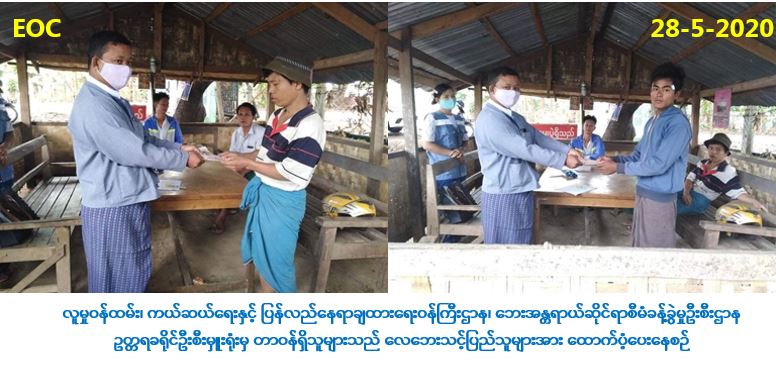 လူမှုဝန်ထမ်း၊ ကယ်ဆယ်ရေးနှင့် ပြန်လည်နေရာချထားရေးဝန်ကြီးဌာန၊ ဘေးအန္တရာယ်ဆိုင်ရာစီမံ ခန့်ခွဲမှုဦးစီးဌာန၊ ဥတ္တရခရိုင်ဦးစီးမှူးရုံးမှ တာဝန်ရှိသူများသည် (၂၇-၅-၂၀၂၀)ရက်နေ့၊ (၁၈:၀၀)နာရီ အချိန်တွင် ပြည်ထောင်စုနယ်မြေ၊ နေပြည်တော်၊ ဥတ္တရခရိုင်၊ ဥတ္တရသီရိမြို့နယ်၊ မင်းကုန်းကျေးရွာ အုပ်စု၊ မင်းကုန်းကျေးရွာနှင့် အောင်သုခကျေးရွာတို့၌ ဖြစ်ပွားခဲ့သော လေဘေးကြောင့် အမိုးလန်နေအိမ် (၁)လုံးနှင့် တစ်စိတ်တစ်ပိုင်းပျက်စီးနေအိမ် (၁)လုံးအတွက် အိမ်ဆောက်ပစ္စည်းဖိုး ထောက်ပံ့ငွေ(၁၅၀,၀၀ဝိ/-)ကျပ်၊ ဘေးသင့်လူဦးရေ(၇)ဦးအတွက် ဆန်ရိက္ခာဖိုးထောက်ပံ့ငွေ (၁၄,၇၀ဝိ/-)ကျပ်၊ စုစုပေါင်းထောက်ပံ့ငွေ (၁၆၄,၇၀ဝိ/-)ကျပ်အား (၂၈-၅-၂၀၂၀)ရက်နေ့၊ (၁၀:၃၀) အချိန်တွင် ဘေးသင့်ပြည်သူများလက်ဝယ်သို့ သွားရောက်ထောက်ပံ့ခဲ့ကြောင်း သတင်းရရှိပါသည်။