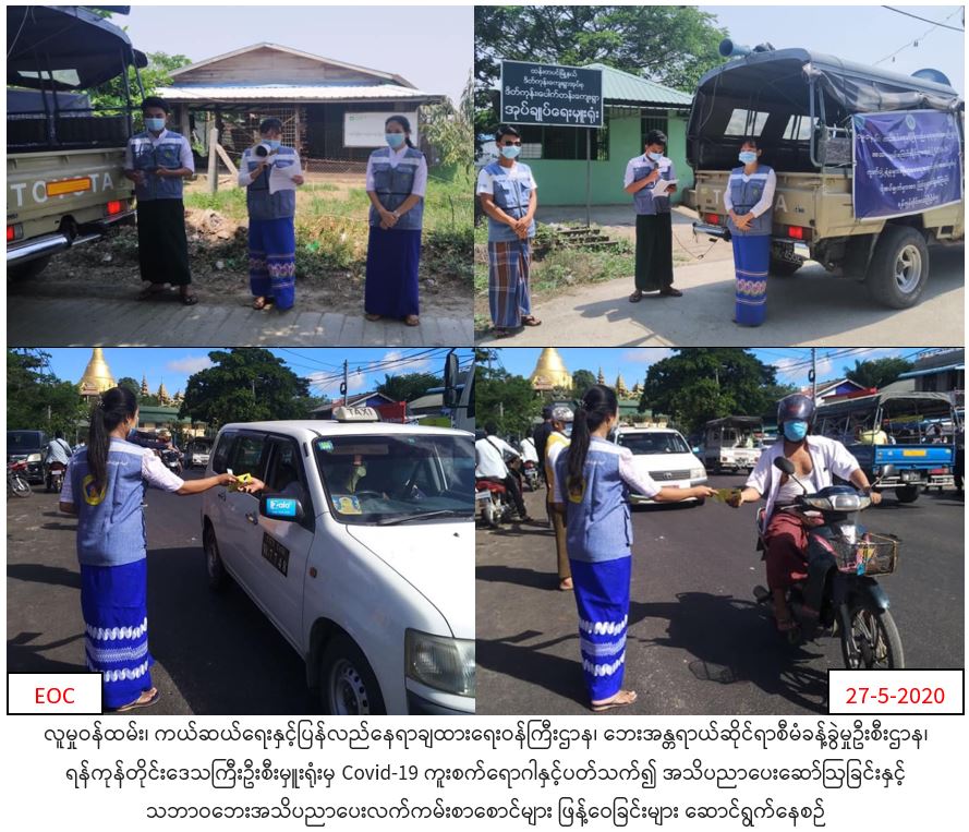 လူမှုဝန်ထမ်း၊ ကယ်ဆယ်ရေးနှင့်ပြန်လည်နေရာချထားရေးဝန်ကြီးဌာန၊ ဘေးအန္တရာယ်ဆိုင်ရာစီမံခန့်ခွဲမှုဦးစီးဌာန၊ ရန်ကုန်တိုင်းဒေသကြီးဦးစီးမှူးရုံးမှ (၂၇ -၅-၂၀၂၀)ရက်နေ့တွင် ရန်ကုန်တိုင်းမြောက်ပိုင်းခရိုင်၊ ထန်းတပင်မြို့နယ်(၂/၄)ရပ်ကွက်၊ သပြေခြံကျေးရွာ၊ ထန်းနှစ်ပင်ကျေးရွာ၊ သံပရာကုန်းကျေးရွာ၊ ကလိန်ကျေးရွာ၊ လမုတန်းကြီးကျေးရွာတို့တွင် Covid-19 ကူးစက်ရောဂါနှင့်ပတ်သက်၍ အများပြည်သူများအား သိရှိလိုက်နာနိုင်ရန် ကျန်းမာရေးနှင့်အားကစားဝန်ကြီးဌာနမှ ထုတ်ပြန်ထားသော အသိပေးကြေငြာချက်များအား ရပ်ကွက်များအတွင်း အသိပေးကြော်ငြာခြင်းများ ပြုလုပ်ခဲ့ပြီး၊ ရန်ကုန်တောင်ပိုင်းခရိုင်ဦးစီးမှူးရုံးမှ သံလျင်မြို့နယ်၊ ဘုရားကုန်းကျေးရွာ၊ ဘုရားကုန်းလမ်းဆုံ၊ ဘုရားကုန်းဈေးတို့တွင် mask campaign နှင့် စားသောက်ဆိုင်များတွင် ကျန်းမာရေးနှင့်အားကစားဝန်ကြီးဌာနမှ ထုတ်ပြန်ထားသော စည်းမျဉ်းစည်းကမ်းများနှင့်အညီရောင်းချစားသုံးစေရေး၊ ရှောင်တခင်စစ်ဆေးခြင်း၊ သဘာဝဘေးအန္တရာယ်ကျရောက်လာပါက ဆောင်ရန်/ရှောင်ရန်များ သိရှိနိုင်စေရန်အတွက် ဘေး(၈)မျိုး လက်ကမ်းစာစောင်ဖြန့်ဝေခြင်းများအား အထွေထွေအုပ်ချုပ်ရေးဦးစီးဌာန၊ မီးသတ်ဦးစီးဌာန၊ မြန်မာနိုင်ငံရဲတပ်ဖွဲ့၊ ကျန်းမာရေးဦးစီးဌာန၊ ယာဉ်ထိန်းတပ်ဖွဲများနှင့်အတူပူးပေါင်းဆောင်ရွက်ခဲ့ကြောင်း သတင်းရရှိပါသည်။