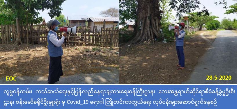လူမှုဝန်ထမ်း၊ ကယ်ဆယ်ရေးနှင့် ပြန်လည်နေရာချထားရေးဝန်ကြီးဌာန၊ ဘေးအန္တရာယ်ဆိုင်ရာ စီမံခန့်ခွဲမှုဦးစီးဌာန၊ ဗန်းမော်ခရိုင်ဦးစီးမှုးရုံးမှ တာဝန်ရှိသူများသည် (၂၈-၅-၂၀၂၀) ရက်နေ့တွင် ဗန်းမော်ခရိုင်၊ မံစီမြို့နယ်၊ တောင်းလိန်ကျေးရွာနှင့် ဟန်ထက်ကျေးရွာတို့တွင် (COVID- 19) ရောဂါကူးစက်ပျံ့နှံ့မှုများနှင့် ပတ်သက်၍ ပြည်သူများထံသို့ hand speaker များဖြင့် လှည့်လည် ဟောပြောခြင်းလုပ်ငန်းများ ဆောင်ရွက်ခဲ့ပါကြောင်း သတင်းရရှိပါသည်။