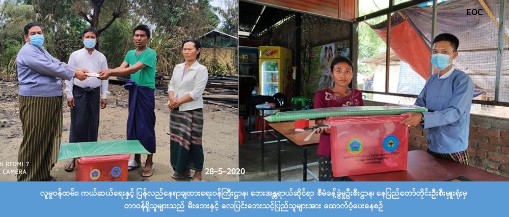 ပြည်ထောင်စုနယ်မြေ၊ နေပြည်တော်၊ လယ်ဝေးမြို့နယ်အတွင်း (၂၇-၅-၂၀၂၀)ရက်နေ့၌ ဖြစ်ပွားခဲ့သော လေပြင်းတိုက်ခတ်မှုကြောင့် ကြောင်ရေအုပ်စု၊ သပြေတန်းကျေးရွာ၊ ပြောင်ခေါင်းကြီးကျေးရွာအုပ်စု၊ ပြောင်ခေါင်းကြီးကျေးရွာ၊ ကြို့ဇလုပ်ကျေးရွာ၊ ပန်းတင်ကျေးရွာ၊ ကဇွန်းခင်းကျေးရွာ၊ ပိတောက်ချောင် အုပ်စု၊ ပိတော်ချောင်ကျေးရွာတို့တွင် ပြိုလဲနေအိမ် (၇) လုံးနှင့် အမိုးလန်နေအိမ် (၁၁)လုံးတို့အတွက် အိမ်ဆောက်ပစ္စည်းဖိုး ထောက်ပံ့ငွေ (၉၃၉,၀၀ဝ/-)ကျပ်၊ ဘေးသင့်လူဦးရေ (၇၄) ဦးအတွက် ဆန်ရိက္ခာ ဖိုးထောက်ပံ့ငွေ (၁၅၅,၄၀ဝ/-)ကျပ်၊ စုစုပေါင်းထောက်ပံ့ငွေ (၁,၀၉၄,၄၀ဝ/-)ကျပ်နှင့် ကယ်ဆယ်ရေး ပစ္စည်း (၁၇) မျိုးပါ (၇) အိမ်ထောင်စာကိုလည်းကောင်း၊ (၂၇-၅-၂၀၂၀) ရက်နေ့တွင် အလယ်ကွန်း ကျေးရွာအုပ်စု၊ မြောင်းမြကျေးရွာ၌ မီးဘေးဖြစ်ပွားမှုကြောင့် လုံးဝပျက်စီးနေအိမ် (၁)လုံးအတွက် အိမ်ဆောက်ပစ္စည်းဖိုးငွေ (၂၀၀,၀၀ဝ/-) ကျပ်၊ ဘေးသင့်လူဦးရေ (၇) ဦးအတွက် ဆန်ရိက္ခာဖိုးငွေ (၁၄,၇၀ဝ/-) ကျပ်၊ စုစုပေါင်းထောက်ပံ့ရန်ပုံငွေ (၂၁၄,၇၀ဝ/-) ကျပ်နှင့် ကယ်ဆယ်ရေးပစ္စည်း (၁၇)မျိုး (၁) အိမ်ထောင်စာတို့ကို လူမှုဝန်ထမ်း၊ ကယ်ဆယ်ရေးနှင့် ပြန်လည်နေရာချထားရေးဝန်ကြီးဌာန၊ ဘေးအန္တရာယ်ဆိုင်ရာ စီမံခန့်ခွဲမှုဦးစီးဌာန၊ နေပြည်တော်တိုင်းဦးစီးမှူးရုံးမှ တိုင်းဦးစီးမှူးနှင့် တာဝန်ရှိသူ များသည် (၂၈-၅-၂၀၂၀) ရက်နေ့ (၁၃:၃၀) အချိန်တွင် ဘေးသင့်ပြည်သူများ လက်ဝယ်သို့ သွားရောက် ထောက်ပံ့ခဲ့ကြောင်း သိရှိရပါသည်။