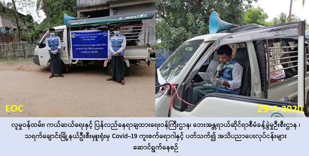 လူမှုဝန်ထမ်း၊ ကယ်ဆယ်ရေးနှင့် ပြန်လည်နေရာချထားရေးဝန်ကြီးဌာန၊ ဘေးအန္တရာယ်ဆိုင်ရာ စီမံခန့်ခွဲမှုဦးစီးဌာန၊ သရက်ချောင်းမြို့နယ်ဦးစီးမှူးရုံးမှ တာဝန်ရှိသူများသည် (၂၉-၅-၂၀၂၀)ရက် နေ့၌ သရက်ချောင်းမြို့နယ်အတွင်းရှိ သရက်ပင်အိုင်ကျေးရွာနှင့် ကျွဲရေအိုင်ကျေးရွာတို့တွင် လော်စပီကာ၊ Hand Speaker တို့ဖြင့် Covid-19 ရောဂါကြိုတင်ကာကွယ် ထိန်းချုပ်နိုင်ရန် အများ ပြည်သူသို့ အသိပညာပေးပန်ကြားချက်များအား လှည့်လည်ကြေညာခြင်းများ ဆောင်ရွက်ခဲ့ ကြောင်း သတင်းရရှိပါသည်။
