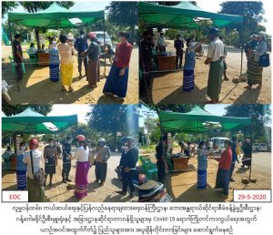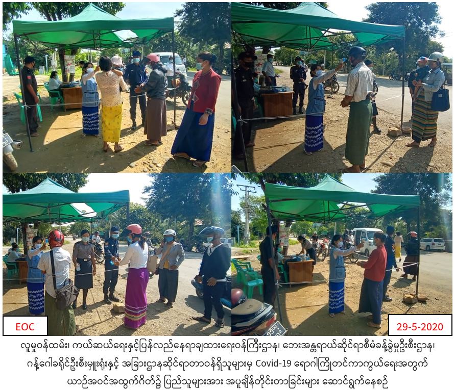 လူမှုဝန်ထမ်း၊ ကယ်ဆယ်ရေးနှင့်ပြန်လည်နေရာချထားရေးဝန်ကြီးဌာန၊ ဘေးအန္တရာယ်ဆိုင်ရာစီမံခန့်မှုဦးစီးဌာန၊ ဂန့်ဂေါခရိုင်ဦးစီးမှူးရုံးမှ တာဝန်ရှိသူများသည် (၂၉-၅-၂၀၂၀) ရက်နေ့ (၀၈း၃၀) နာရီအချိန်မှ (၁ရး၃၀)နာရီအချိန်ထိ Covid-19 ကူးစက်ရောဂါ ကြိုတင်ကာကွယ်ရေးအတွက် ဂန့်ဂေါခရိုင်အတွင်း ယာဉ်အဝင်အထွက်စီးနင်း လိုက်ပါလာသော ခရီးသည်များအား ကိုယ်အပူချိန်များတိုင်းခြင်းနှင့် ပြည်တွင်းပြည်ပမှ ပြန်လာသူများအား စာရင်းပြုစုခြင်းတို့ကို ခရိုင်အုပ်ချုပ်ရေးမှူး၊ မြို့နယ်အုပ်ချုပ်ရေးမှူး၊ ဌာနဆိုင်ရာအသီးသီးမှ တာဝန်ရှိသူများနှင့်အတူ ပူးပေါင်းဆောင်ရွက်လျက်ရှိကြောင်း သတင်းရရှိပါသည်။