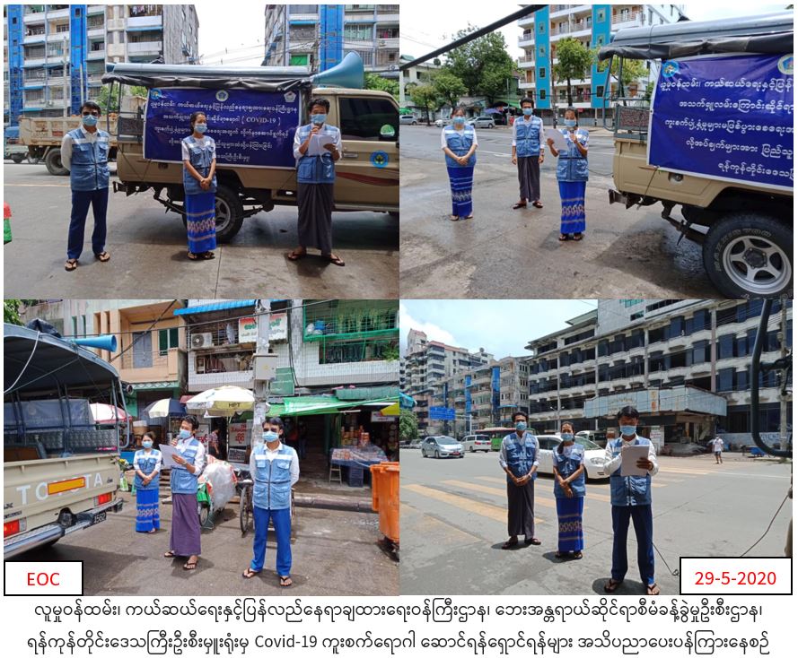 လူမှုဝန်ထမ်း၊ ကယ်ဆယ်ရေးနှင့်ပြန်လည်နေရာချထားရေးဝန်ကြီးဌာန၊ ဘေးအန္တရာယ်ဆိုင်ရာစီမံခန့်ခွဲမှုဦးစီးဌာန၊ ရန်ကုန်တိုင်းဒေသကြီးဦးစီးမှူးရုံးမှ (၂၉-၅-၂၀၂၀)ရက်နေ့တွင် ရန်ကုန်အရှေ့ပိုင်းခရိုင်၊ ပုဇွန်တောင်မြို့နယ်၊ အမှတ်(၇,၈,၉,၁၀)ရပ်ကွက်တို့တွင် Covid-19 ကူးစက်ရောဂါနှင့်ပတ်သက်၍ အများပြည်သူများသိရှိလိုက်နာရန် ကျန်းမာရေးနှင့်အားကစားဝန်ကြီးဌာနမှ ထုတ်ပြန်ထားသော အသိပညာပေးကြေငြာချက်များအား အသိပညာပေးဆော်ဩခြင်းများ ဆောင်ရွက်ခဲ့ကြောင်း သတင်းရရှိပါသည်။