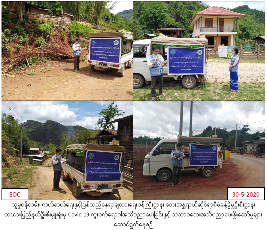 လူမှုဝန်ထမ်း၊ ကယ်ဆယ်ရေးနှင့်ပြန်လည်နေရာချထားရေးဝန်ကြီးဌာန၊ ဘေးအန္တရာယ်ဆိုင်ရာစီမံခန့်ခွမှုဦးစီးဌာန၊ ကယားပြည်နယ်ဦးစီးမှူးရုံးမှ တာဝန်ရှိသူများသည် ( ၃၀.၅.၂၀၂၀)ရက်နေ့တွင် ဒီးမော့ဆိုမြို့နယ်၊ ဒေါရောက်ခူကျေးရွာအုပ်စု၊ လေမအန်းခူကျေးရွာ၊ ဒေါဝယ်ကူးကျေးရွာ၊ ခူးဘာတိုကျေးရွာ၊ ဆောင်ဒူလာကျေးရွာအုပ်စု၊ ဒိုင်းလင်းအေးသာကျေးရွာများရှိ ပြည်သူများအား COVID-19ကူးစက်ရောဂါ ပြန့်ပွားမှုမဖြစ်ပွားစေရန်အတွက် သိရှိလိုက်နာရန်အချက်များနှင့် သဘာဝဘေးအန္တရာယ်နှင့်စပ်လျဉ်းသည့် ဆောင်ရန်၊ ရှောင်ရန်များကို အသိပညာပေးနှိုးဆော်မှုများ ဆောင်ရွက်ခဲ့ကြောင်း သတင်းရရှိပါသည်။