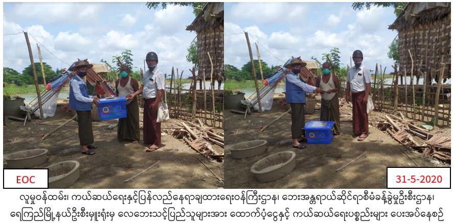 လူမှုဝန်ထမ်း၊ ကယ်ဆယ်ရေးနှင့်ပြန်လည်နေရာချထားရေးဝန်ကြီးဌာန၊ ဘေးအန္တရာယ်ဆိုင်ရာစီမံခန့်ခွဲမှုဦးစီးဌာန၊ ရေကြည်မြို့နယ်ဦးစီးမှုးရုံးမှတာဝန်ရှိသူများသည် ရေကြည်မြို့နယ်၊ သစ်ဖြူပင်ကျေးရွာအုပ်စု၊ သစ်ဖြူပင်ကျေးရွာတွင်(၂၈.၅.၂၀၂၀၂၀)ရက်နေ့တွင် ဖြစ်ပွားသောလေဘေးကြောင့် ပြိုကျ/ပျက်စီးနေအိမ် (၁)လုံးအတွက်အိမ်ဆောက်ပစ္စည်းဖိုးရန်ပုံငွေ(၁၀၀၀၀ဝိ/-) ၊ လူဦးရ(၈)ဦးအတွက်(၇)ရက်စာ ဆန်ရိက္ခာရန်ပုံငွေ(၁၆၈၀ဝိ/-)၊ ကယ်ဆယ်ရေးပစ္စည်း(၁၇)မျိုးပါ (၁)အိမ်ထောင်စာ(၃၄၇၅၃ိ/-)နှင့် စုစုပေါင်းကယ်ဆယ်ရေးရန်ပုံငွေ(၁၁၆၈၀ဝိ/-)အား (၃၁.၅.၂၀၂၀)ရက်နေ့(၁၁:၁၅)နာရီအချိန်တွင် တာဝန်ရှိသူများရှေ့မှောက်၌ ဘေးသင့်ပြည်သူများလက်ဝယ်အရောက်ထောက်ပံ့ပေးအပ်ခဲ့ကြောင်း သတင်းရရှိပါသည်။
