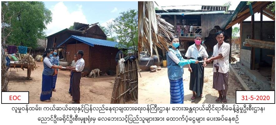 လူမှုဝန်ထမ်း၊ ကယ်ဆယ်ရေးနှင့်ပြန်လည်နေရာချထားရေးဝန်ကြီးဌာန၊ ဘေးအန္တရာယ်ဆိုင်ရာစီမံခန့်ခွဲမှုဦးစီးဌာန၊ ညောင်ဦးခရိုင်ဦးစီးမှူးရုံးမှ (၃၀.၅.၂၀၂၀) ရက်နေ့ (၁၉:၀၀)အချိန် ၌ ညောင်ဦးခရိုင်၊ ကျောက်ပန်းတောင်းမြို့နယ်တွင် မိုးရွာသွန်းပြီး လေပြင်းတိုက်ခတ်မှုဖြစ်ပွားခဲ့ရာ ရွာလုကျေးရွာအုပ်စု၊ ရွာလုကျေးရွာမှ လူနေအိမ် (၃) လုံး အမိုးလန်ပျက်စီးမှု ဖြစ်ပွားခဲ့သဖြင့် အဆိုပါ လေဘေးသင့် အိမ်ထောင်စု (၃)စုမှ လူဦးရေ (၁၂)ဦး အတွက် ဆန်ရိက္ခာဖိုး (၂၅,၂၀၀) ကျပ်နှင့် အိမ်ဆောက်ပစ္စည်းဖိုး (၁၄၅,၀၀၀) ကျပ်၊ စုစုပေါင်း ကယ်ဆယ်ရေးရန်ပုံငွေ (၁၇၀,၂၀၀)ကျပ်တို့ကို (၃၁.၅.၂၀၂၀)ရက်နေ့ (၁၁း၃၀)အချိန်၌ ဘေးသင့်ပြည်သူများ၏ လက်ဝယ်အရောက် သွားရောက် ထောက်ပံ့ပေးအပ်ခဲ့ကြောင်း သတင်းရရှိပါသည်။