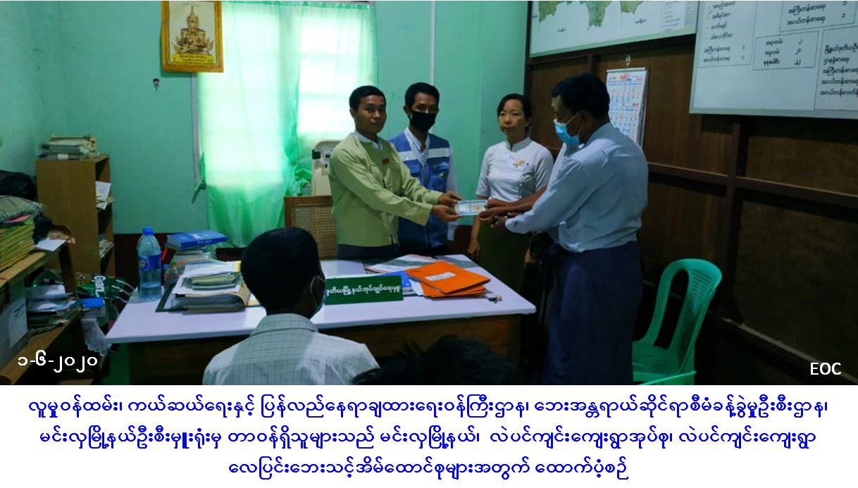 လူမှုဝန်ထမ်း၊ ကယ်ဆယ်ရေးနှင့် ပြန်လည်နေရာချထားရေးဝန်ကြီးဌာန၊ ဘေးအန္တရာယ်ဆိုင်ရာစီမံခန့်ခွဲမှုဦးစီးဌာန၊ မင်းလှမြို့နယ်ဦးစီးမှူးရုံးမှ တာဝန်ရှိသူများသည် မင်းလှမြို့နယ်၊ လဲပင်ကျင်းကျေးရွာအုပ်စု၊ လဲပင်ကျင်းကျေးရွာ၌ (၂၈-၅-၂၀၂၀)ရက်နေ့၊ (၁၇:၁၅) နာရီအချိန်တွင် လေပြင်းတိုက်ခတ်မှုကြောင့် နေအိမ်(၈)လုံး အမိုးလန်ပျက်စီးခဲ့ပြီး အိမ်ခြေ(၈)လုံး၊ အိမ်ထောင်စု(၈)စု၊ လူဦးရေစုစုပေါင်း (၃၈) ဦး ဘေးသင့်ခဲ့ရာ ဘေးသင့်လူဦးရေ (၃၈) ဦးအတွက် ဆန်ရိက္ခာဖိုး(၇)ရက်စာ (၇၉၈၀ဝိ/-) နှင့် နေအိမ်(၈)လုံးအတွက် အိမ်ဆောက်ပစ္စည်းဖိုး (၁၅၃၀ဝဝိ/-)၊ ထောက်ပံ့ရန်ပုံငွေစုစုပေါင်း (၂၃၂၈၀ဝိ/-) တိတိအား (၁-၆-၂၀၂၀) ရက်နေ့တွင် မင်းလှမြို့နယ်အထွေထွေအုပ်ချုပ်ရေးဦးစီးဌာနမှ တာဝန်ရှိသူများ ရှေ့မှောက်တွင် လွှဲပြောင်းထောက်ပံ့ပေးအပ်ခဲ့ကြောင်း သတင်းရရှိပါသည်။