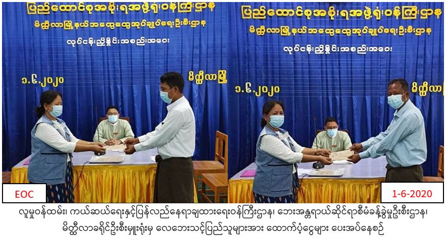 လူမှုဝန်ထမ်း၊ ကယ်ဆယ်ရေးနှင့်ပြန်လည်နေရာချထားရေးဝန်ကြီးဌာန၊ ဘေးအန္တရာယ်ဆိုင်ရာစီမံခန့်ခွဲမှုဦးစီးဌာန၊ မိတ္ထီလာခရိုင်ဦးစီးမှူးရုံးမှတာဝန်ရှိသူများသည် (၂၉-၅-၂၀၂၀)ရက်နေ့တွင် မိတ္ထီလာမြို့နယ်ရုံးတောအုပ်စု၊ ကန်တောင်အုပ်စု၊ ကွက်ငယ်အုပ်စု၊ ဂဠုန်ကုန်းအုပ်စုနှင့် နန်းတော်ကုန်းရပ်ကွက် နယ်မြေ(၇)တို့တွင် ဖြစ်ပွားခဲ့သောလေဘေးသင့် အမိုးလန်အိမ်(၈)လုံးအတွက် အိမ်ဆောက်ပစ္စည်းဖိုးငွေ(၅၂၅၈၀၀)ကျပ်၊ လူဉီးရေ(၃၃)ဦးအတွက် ဆန်ရိက္ခာဖိုးငွေ(၆၉၃၀၀)ကျပ်တို့ကို (၁-၆-၂၀၂၀)ရက်နေ့တွင် ထောက်ပံ့ပေးအပ်ခဲ့ကြောင်း သတင်းရရှိပါသည်။