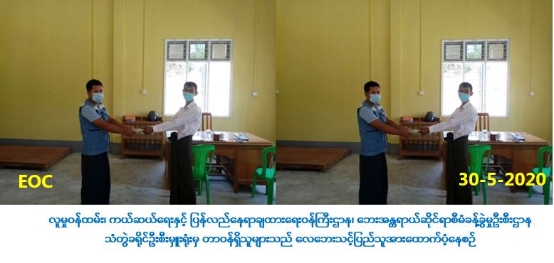 လူမှုဝန်ထမ်း၊ ကယ်ဆယ်ရေးနှင့် ပြန်လည်နေရာချထားရေးဝန်ကြီးဌာန၊ ဘေးအန္တရာယ်ဆိုင်ရာစီမံ ခန့်ခွဲမှုဦးစီးဌာန၊ ရခိုင်ပြည်နယ်၊ သံတွဲခရိုင်ဦးစီးမှူးရုံးမှ တာဝန်ရှိသူများသည် (၁၉-၅-၂၀၂၀) ရက်နေ့တွင် ဖြစ်ပွားသော ရခိုင်ပြည်နယ်၊ သံတွဲခရိုင်၊ သံတွဲမြို့နယ်၊ ကျွဲသောက်ကျေးရွာအုပ်စု၊ ဆင်ဒင်ကြီးကျေးရွာ၌ လေပြင်းဘေးကြောင့် (ဓနိမိုး၊ပျဉ်ခင်း၊ပျဉ်ကာ) နေအိမ် (တစိတ်တပိုင်း ပျက်စီး)(၁)လုံးအတွက် အိမ်ဆောက်ပစ္စည်းဖိုးထောက်ပံ့ငွေ (၂၀,၀၀၀/-)ကျပ်နှင့် ဘေးသင့်လူဦးရေ (၅)ဦးအတွက် ဆန်ရိက္ခာဖိုးထောက်ပံ့ငွေ(၇)ရက်စာဖိုး (၁၀,၅၀ဝိ/-) ကျပ်၊ စုစုပေါင်းရန်ပုံငွေ (၃၀,၅၀၀/-) ကျပ်ကို (၃၀-၅-၂၀၂၀)ရက်နေ့တွင် ဘေးသင့်ပြည်သူလက်ဝယ်အရောက် ထောက်ပံ့ခဲ့ ပါကြောင်း သတင်းရရှိပါသည်။