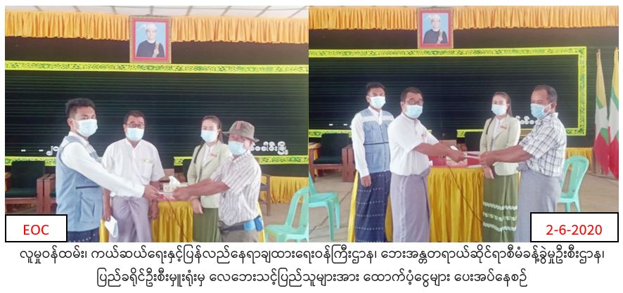 လူမှုဝန်ထမ်း၊ ကယ်ဆယ်ရေးနှင့်ပြန်လည်နေရာချထားရေးဝန်ကြီးဌာန၊ ဘေးအန္တရာယ်ဆိုင်ရာစီမံခန့်ခွဲမှုဦးစီးဌာန၊ ပြည်ခရိုင်ဦးစီးမှူးရုံးမှတာဝန်ရှိသူများသည် ပေါက်ခေါင်းမြို့နယ်၊ ပိတောက်ကုန်းကျေးရွာအုပ်စု၊ သစ်ရောင်းပြန်အုပ်စုနှင့် အမှတ်(၂)ရပ်ကွက်တို့၌ (၁-၆-၂၀၂၀)ရက်နေ့၊ (၀၅:၁၀)နာရီအချိန်တွင် ဖြစ်ပွားခဲ့သော လေပြင်းဘေးကြောင့် အမိုးလန်နေအိမ် (၄)လုံးအတွက် အိမ်ဆောက်ပစ္စည်းဖိုးထောက်ပံ့ငွေ (၁၃၀၀၀၀)ကျပ်အား (၂-၆-၂၀၂၀)ရက်နေ့၊ (၁၁:၀၀)နာရီအချိန်တွင် အထွေထွေအုပ်ချုပ်ရေးဌာနမှ တာဝန်ရှိသူများနှင့်အတူ သွားရောက်ထောက်ပံ့ ပေးအပ်ခဲ့ကြောင်း သတင်းရရှိပါသည်။