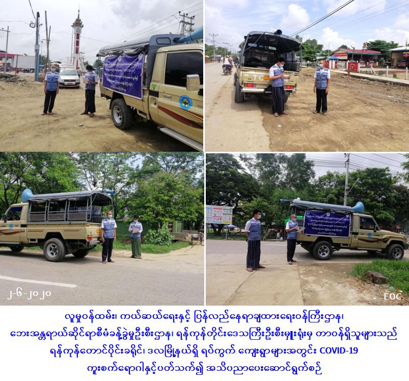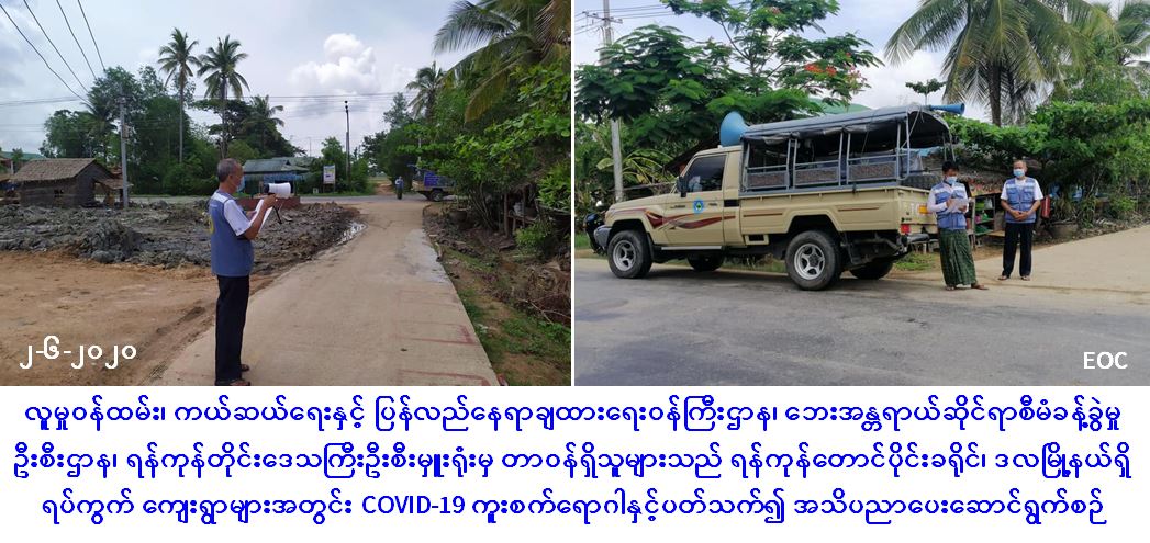 လူမှုဝန်ထမ်း၊ ကယ်ဆယ်ရေးနှင့် ပြန်လည်နေရာချထားရေးဝန်ကြီးဌာန၊ ဘေးအန္တရာယ်ဆိုင်ရာစီမံခန့်ခွဲမှုဦးစီးဌာန၊ ရန်ကုန်တိုင်းဒေသကြီးဦးစီးမှူးရုံးမှ တာဝန်ရှိသူများသည် (၂-၆-၂၀၂၀) ရက်နေ့တွင် ရန်ကုန်တောင်ပိုင်းခရိုင်၊ ဒလမြို့နယ်၊ အမှတ်(၆/၁၁/၁၄)ရပ်ကွက်၊ ညောင်ကုန်းရပ်ကွက်၊ မှော်စက်ရပ်ကွက်၊ ဆာပါချောင်ရပ်ကွက်၊ ကျောင်းစုရပ်ကွက်၊ ဘိုဖြူချောင်းကျေးရွာ၊ ညောင်ချောင်းကျေးရွာ၊ ခနောင်ရွာမကျေးရွာ၊ ခနောင်(အထက်)ကျေးရွာ၊ ခနောင်(ရှမ်းစု)ကျေးရွာတို့၌ Covid-19 အသက်ရှူလမ်းကြောင်းဆိုင်ရာရောဂါနှင့်ပတ်သက်၍ အများပြည်သူများသိရှိလိုက်နာနိုင်ရန် ကျန်းမာရေးနှင့် အားကစားဝန်ကြီးဌာနက ထုတ်ပြန်ထားသော အသိပေးကြေငြာချက်များအား ရပ်ကွက်များအတွင်း အသိပေးကြော်ငြာခြင်းများ ပြုလုပ်ခဲ့ကြောင်း သတင်းရရှိပါသည်။