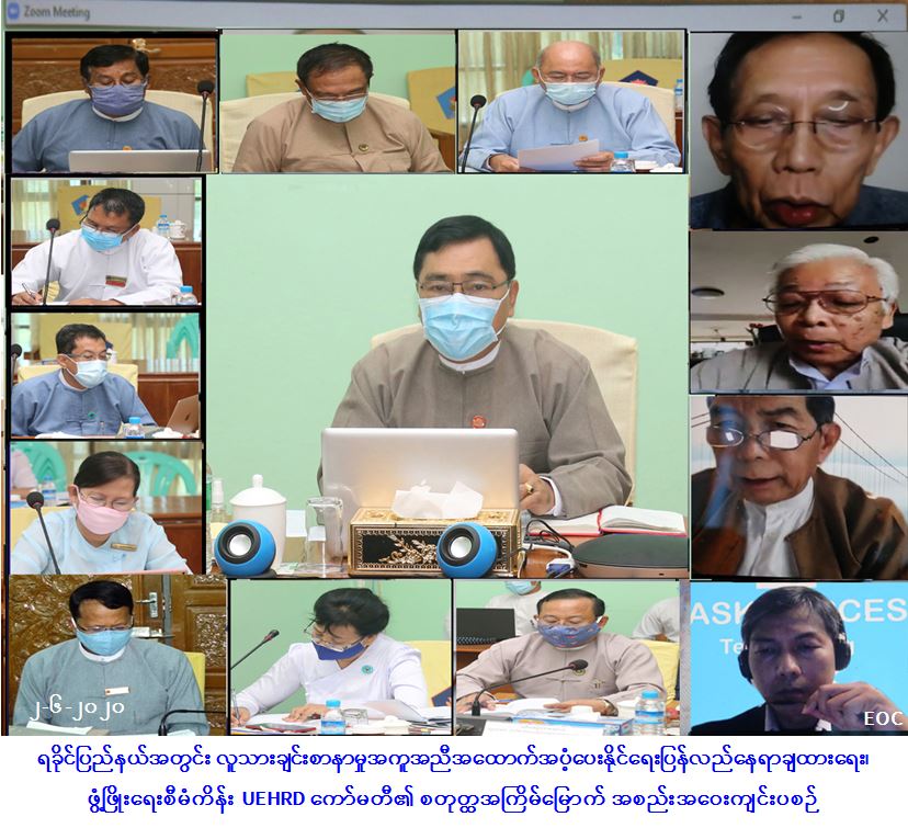 ရခိုင်ပြည်နယ်အတွင်း လူသားချင်းစာနာမှုအကူအညီအထောက်အပံ့ပေးရေးပြန်လည်နေရာချထားရေး၊ ဖွံ့ဖြိုးရေးစီမံကိန်း UEHRD ကော်မတီ၏ စတုတ္ထအကြိမ်မြောက်အစည်းအဝေးကို (၂-၆-၂၀၂၀) ရက်နေ့၊ မွန်းလွဲပိုင်းက လူမှုဝန်ထမ်း၊ ကယ်ဆယ်ရေးနှင့် ပြန်လည်နေရာချထားရေးဝန်ကြီးဌာနအစည်းအဝေးခန်းမ၌ Zoom Video Conferencing System ဖြင့် Online Meeting ပြုလုပ်ကျင်းပရာ UEHRD ကော်မတီဒုတိယဥက္ကဌ ပြည်ထောင်စုဝန်ကြီး ဒေါက်တာဝင်းမြတ်အေး တက်ရောက်အမှာစကားပြောကြားခဲ့ပါသည်။