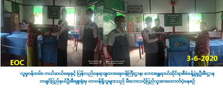 လူမှုဝန်ထမ်း၊ ကယ်ဆယ်ရေးနှင့် ပြန်လည်နေရာချထားရေးဝန်ကြီးဌာန၊ ဘေးအန္တရာယ်ဆိုင်ရာစီမံ ခန့်ခွဲမှုဦးစီးဌာန၊ ကချင်ပြည်နယ်ဦးစီးမှူးရုံးမှ တာဝန်ရှိသူများသည် (၃၁-၅-၂၀၂၀)ရက်နေ့တွင် မြစ်ကြီးနားမြို့နယ်၊ စီတာပူရပ်ကွက်၊ ဂင်ဒိုင်နယ်မြေ အမှတ် (၂၀၄)၌ ဖြစ်ပွားခဲ့သော မီးဘေးကြောင့် ဘေးသင့်အိမ်ခြေ(၁)လုံးအတွက် အိမ်ဆောက်ပစ္စည်းဖိုးထောက်ပံ့ငွေ (၁၀၀,၀၀၀/-)ကျပ်၊ လူဦးရေ (၃)ဦးအတွက် ဆန်ရိက္ခာ(၇)ရက်စာထောက်ပံ့ဖိုးငွေ (၆,၃၀၀)ကျပ်၊ စုစုပေါင်းထောက်ပံ့ငွေ (၁၀၆,၃၀၀/-) ကျပ်နှင့် ကယ်ဆယ်ရေးပစ္စည်း (၁၇)မျိုး အိမ်ထောင်စု (၁)စုစာတို့အား (၃-၆-၂၀၂၀) ရက်နေ့၊ (၁၀:၃၀) နာရီအချိန်တွင် စီတာပူရပ်ကွက်အုပ်ချုပ်ရေးမှူးရုံး၌ မီးဘေးသင့်ပြည်သူများ လက်ဝယ်အရောက်သွားရောက် ထောက်ပံ့ပေးအပ်ခဲ့ကြောင်း သတင်းရရှိပါသည်။