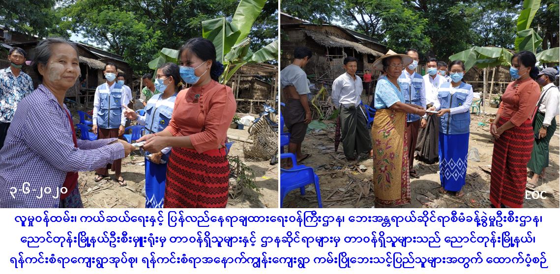 လူမှုဝန်ထမ်း၊ ကယ်ဆယ်ရေးနှင့် ပြန်လည်နေရာချထားရေးဝန်ကြီးဌာန၊ ဘေးအန္တရာယ်ဆိုင်ရာစီမံခန့်ခွဲမှုဦးစီးဌာန၊ ညောင်တုန်းမြို့နယ်ဦးစီးမှူးရုံးမှ တာဝန်ရှိသူများသည် ညောင်တုန်းမြို့နယ်၊ ရန်ကင်းစံရာကျေးရွာအုပ်စု၊ ရန်ကင်းစံရာအနောက်ကျွန်းကျေးရွာ၌ (၂-၆-၂၀၂၀) ရက်နေ့တွင် ဖြစ်ပွားခဲ့သော ကမ်းပြိုဘေးကြောင့် ကြိုတင်ဖျက်သိမ်းပြောင်းရွှေ့ခဲ့သည့်နေအိမ် (၃) လုံး၊ အိမ်ထောင်စု (၃) စုမှ လူဦးရေ (၁၂) ဦးအတွက် ဆန်ရိက္ခာ (၇) ရက်စာဖိုးထောက်ပံ့ငွေ (၂၅၂၀ဝိ/-)၊ အိမ်ဆောက်ပစ္စည်းဖိုးရန်ပုံငွေ (၃၀၀၀၀ဝိ/-)၊ စုစုပေါင်းရန်ပုံငွေ (၃၂၅၂၀ဝိ/-) အား (၃-၆-၂၀၂၀) ရက်နေ့၊ (၁၁:၀၀) နာရီအချိန်တွင် အမျိုးသားလွှတ်တော်ကိုယ်စားလှယ်၊ တိုင်းဒေသကြီးလွှတ်တော်ကိုယ်စားလှယ်၊ မြို့နယ်အထွေထွေအုပ်ချုပ်ရေးဦးစီးဌာနတို့မှ တာဝန်ရှိသူများလိုက်ပါလျက် ကမ်းပြိုဘေးသင့်ပြည်သူများ လက်ဝယ်အရောက် ကွင်းဆင်းထောက်ပံ့ခဲ့ကြောင်း သတင်းရရှိပါသည်။