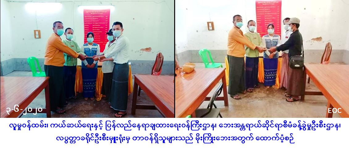 လူမှုဝန်ထမ်း၊ ကယ်ဆယ်ရေးနှင့် ပြန်လည်နေရာချထားရေးဝန်ကြီးဌာန၊ ဘေးအန္တရာယ်ဆိုင်ရာစီမံခန့်ခွဲမှုဦးစီးဌာန၊ လပွတ္တာခရိုင်ဦးစီးမှူးရုံးမှ တာဝန်ရှိသူများသည် လပွတ္တာမြို့နယ်၊ ညောင်ချောင်းကျေးရွာအုပ်စု၊ စာဆွဲကျေးရွာနှင့် မောင်ငယ်ကျေးရွာအုပ်စု၊အုန်းပင်စုကျေးရွာတို့၌ (၁-၆-၂၀၂၀) ရက်နေ့တွင် မိုးကြိုးပစ်ခတ်မှုကြောင့် သေဆုံးခဲ့သူ(၂)ဉီးအတွက် ထောက်ပံ့ရန်ပုံငွေ (၆၀၀၀၀၀)ကျပ်ကိုလည်းကောင်း၊ လပွတ္တာမြို့နယ်၊ ထင်းပုံကွင်းကျေးရွာ၊ အောင်မင်္ဂလာကျေးရွာ၌ (၂-၆-၂၀၂၀) ရက်နေ့တွင် မိုးကြိုးပစ်ခတ်မှုကြောင့် သေဆုံးခဲ့သူ(၁)ဉီးအတွက် ထောက်ပံ့ရန်ပုံငွေ(၃၀၀၀၀၀)ကျပ်ကိုလည်းကောင်း (၃-၆-၂၀၂၀) ရက်နေ့၊ (၁၀:၃၀)နာရီအချိန်တွင် လပွတ္တာမြို့နယ်အထွေထွေအုပ်ချုပ်ရေးဉီးစီးဌာန၌ ဒုတိယမြို့နယ်အုပ်ချုပ်ရေးမှူး၊လွှတ်တော်ကိုယ်စားလှယ်ရုံးမှ တာဝန်ရှိသူ၊ ကျေးရွာအုပ်ချုပ်ရေးမှူး၊ ကျေးရွာတာဝန်ခံတို့နှင့်အတူ ဘေးသင့်ပြည်သူများအား ထောက်ပံ့ခဲ့ကြောင်း သတင်းရရှိပါသည်။
