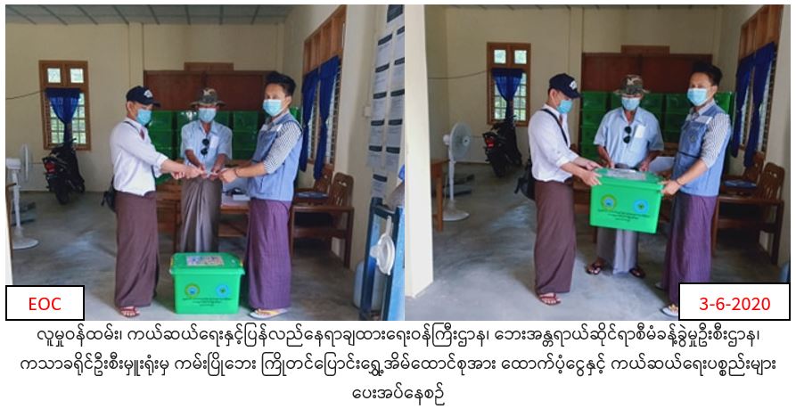 လူမှုဝန်ထမ်း၊ ကယ်ဆယ်ရေးနှင့်ပြန်လည်နေရာချထားရေးဝန်ကြီးဌာန၊ ဘေးအန္တရာယ်ဆိုင်ရာစီမံခန့်ခွဲမှုဦးစီးဌာန၊ ကသာခရိုင်ဦးစီးမှူးရုံးမှ၊ ကသာမြို့နယ်၊ မြေနုကျေးရွာအုပ်စု၊ မြေနုကျေးရွာ၊ (၂-၆-၂၀၂၀)နေ့ ဖြစ်ပွားသော ကမ်းပြိုပြောင်းရွှေ့အိမ်ထောင်စု (၁)စု အတွက် အိမ်ဆောက်ပစ္စည်းဖိုးထောက်ပံ့ငွေ (၁၀၀၀၀၀)ကျပ်၊ ဆန်ရိက္ခာဖိုးထောက်ပံ့ငွေ (၁၂၆၀၀)ကျပ်၊ စုစုပေါင်း(၁၁၂၆၀၀)ကျပ်နှင့် ကယ်ဆယ်ရေးပစ္စည်း(၁၀)မျိုး (၁)အိမ်ထောင်စာတို့အား (၃-၆-၂၀၂၀) ရက်နေ့ (၁၃:၀၀) နာရီအချိန်တွင် သက်ဆိုင်ရာကျေးရွာ အုပ်ချုပ်ရေးမှူးမှတဆင့် ဘေးသင့်ပြည်သူထံသို့ ထောက်ပံ့ပေးအပ်ခဲ့ကြောင်း သတင်းရရှိပါသည်။