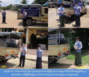 လူမှုဝန်ထမ်း၊ ကယ်ဆယ်ရေးနှင့်ပြန်လည်နေရာချထားရေးဝန်ကြီးဌာန၊ ဘေးအန္တရာယ်ဆိုင်ရာ စီမံခန့်ခွဲမှုဦးစီးဌာန၊ ရန်ကုန်တိုင်းဒေသကြီးဦးစီးမှူးရုံးမှ တာဝန်ရှိသူများသည် (၃-၆-၂၀၂၀) ရက် နေ့တွင် တောင်ပိုင်းခရိုင်၊ တွံတေးမြို့နယ်၊ ခတ္တိယကျေးရွာ၊ အကလကျေးရွာ၊ ကသပေါင်းကျေး ရွာ၊ ကျွဲကျွဲဒရွတ်ကျေးရွာ၊ ကရင်ချောင်ကျေးရွာ၊ ခနောင်ထိန်တပင်ကျေးရွာ၊ စာဖြူစုကျေးရွာ၊ ရေ တွင်းကုန်းကျေးရွာတို့တွင် Covid-19 အသက်ရှူလမ်းကြောင်းဆိုင်ရာရောဂါနှင့် ပတ်သက်၍ အများပြည်သူများသိရှိလိုက်နာနိုင်ရန် ကျန်းမာရေးနှင့်အားကစားဝန်ကြီးဌာနမှ ထုတ်ပြန်ထား သောအသိပေးကြေငြာချက်များအား အရာထမ်း/အမှုထမ်းများမှ ရပ်ကွက်များအတွင်း အသိပေး ကြော်ငြာခြင်းများ ပြုလုပ်ခဲ့ပါကြောင်းသတင်းရရှိပါသည်။