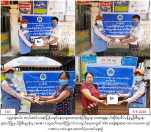 လူမှုဝန်ထမ်း၊ ကယ်ဆယ်ရေးနှင့်ပြန်လည်နေရာချထားရေးဝန်ကြီးဌာန၊ ဘေးအန္တရာယ်ဆိုင်ရာစီမံခန့်ခွဲမှုဦးစီးဌာန၊ မူဆယ်မြို့နယ်ဦးစီးမှူးရုံးမှ တာဝန်ရှိသူများသည် Covid-19 ကူးစက်ရောဂါ ကြိုတင်ကာကွယ်ရေးနှင့်စပ်လျဉ်း၍ (၃.၆.၂၀၂၀)ရက်နေ့ နမ့်ခမ်းမြို့နယ်အတွင်းရှိ ဂျော်(၁)စခန်း၊ နေဝန်းနီစခန်း၊ စိန့်သောမတ်စ်စခန်းစသည့် IDP(camps) (၃)ခုအတွက် စခန်း(၁)ခုလျှင် handspeaker(၁)ခုနှင့်memory stick(၁)ခုစီတို့အားထောက်ပံ့ပေးအပ်ခဲ့ကြောင်း သတင်းရရှိပါသည်။