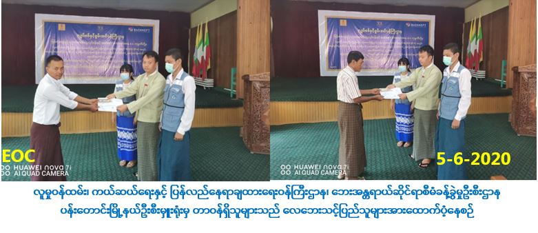 လူမှုဝန်ထမ်း၊ ကယ်ဆယ်ရေးနှင့် ပြန်လည်နေရာချထားရေးဝန်ကြီးဌာန၊ ဘေးအန္တရာယ်ဆိုင်ရာစီမံ ခန့်ခွဲမှုဦးစီးဌာန၊ ပန်းတောင်းမြို့နယ်ဦးစီးမှူးရုံးမှ တာဝန်ရှိသူများသည် ပြည်ခရိုင်၊ ပန်းတောင်း မြို့နယ်၊ ကြိုးကြာကျေးရွာအုပ်စု၊ ကြာအင်းကျေးရွာ (၃၀-၅-၂၀၂၀) ရက်နေ့နှင့် လှည်ကူး ကျေးရွာအုပ်စုသရက်ခုံကျေးရွာ (၃၁-၅-၂၀၂၀) ရက်နေ့တို့တွင် ဖြစ်ပွားသော လေဘေးသင့်အမိုးလန် နေအိမ် (၁၂) လုံးတို့အတွက် အိမ်ဆောက်ပစ္စည်းဖိုးထောက်ပံ့ငွေ (၄၀၀,၈၀၀/-) ကျပ်အား (၅-၆-၂၀၂၀) ရက်နေ့၊ (၁၀း၀၀)နာရီအချိန်တွင် သွားရောက်ထောက်ပံပေးအပ်ခဲ့ကြောင်း သတင်းရရှိ ပါသည်။