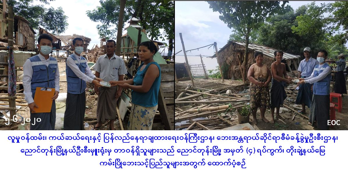လူမှုဝန်ထမ်း၊ ကယ်ဆယ်ရေးနှင့် ပြန်လည်နေရာချထားရေးဝန်ကြီးဌာန၊ ဘေးအန္တရာယ်ဆိုင်ရာစီမံခန့်ခွဲမှုဦးစီးဌာန၊ ညောင်တုန်းမြို့နယ်ဦးစီးမှူးရုံးမှ တာဝန်ရှိသူများသည် ညောင်တုန်းမြို့၊ အမှတ် (၄) ရပ်ကွက်၊ တိုးချဲ့နယ်မြေ၌ (၄-၆-၂၀၂၀) ရက်နေ့တွင် ဖြစ်ပွားခဲ့သော ကမ်းပြိုဘေးကြောင့် ကြိုတင်ဖျက်သိမ်းပြောင်းရွှေ့ခဲ့သည့်နေအိမ် (၂) လုံး၊ အိမ်ထောင်စု (၂) စုမှ လူဦးရေ (၉) ဦးအတွက် ဆန်ရိက္ခာ (၇) ရက်စာ (၁၈၉၀ဝိ/-)၊ အိမ်ဆောက်ပစ္စည်းဖိုးရန်ပုံငွေ (၂၀၀၀၀ဝိ/-)၊ စုစုပေါင်းရန်ပုံငွေ (၂၁၈၉၀ဝိ/-) အား (၅-၆-၂၀၂၀) ရက်နေ့၊ (၁၂:၀၀) နာရီအချိန်တွင် ကမ်းပြိုဘေးသင့်ပြည်သူများ လက်ဝယ်အရောက် ကွင်းဆင်းထောက်ပံ့ခဲ့ကြောင်း သတင်းရရှိပါသည်။