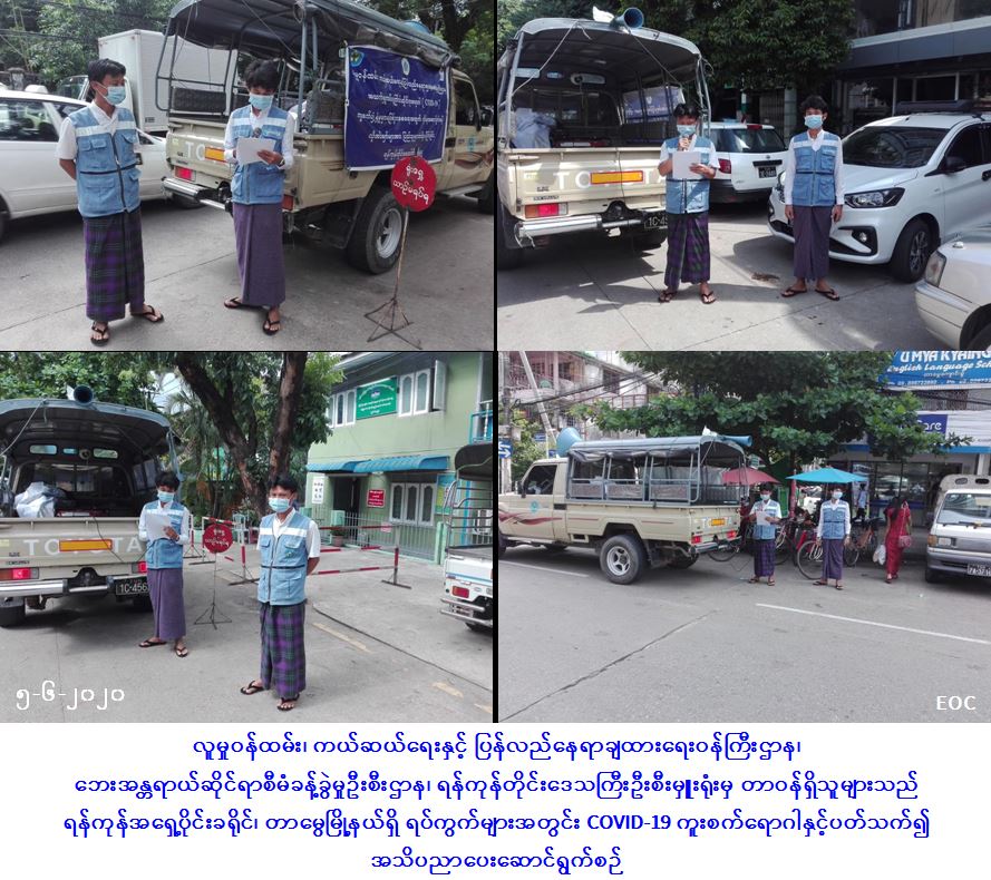 လူမှုဝန်ထမ်း၊ ကယ်ဆယ်ရေးနှင့် ပြန်လည်နေရာချထားရေးဝန်ကြီးဌာန၊ ဘေးအန္တရာယ်ဆိုင်ရာစီမံခန့်ခွဲမှုဦးစီးဌာန၊ ရန်ကုန်တိုင်းဒေသကြီးဦးစီးမှူးရုံးမှ တာဝန်ရှိသူများသည် (၅-၆-၂၀၂၀) ရက်နေ့တွင် ရန်ကုန်အရှေ့ပိုင်းခရိုင်၊ တာမွေမြို့နယ်၊ မအူကုန်းရပ်ကွက်၊ ပုဏ္ဏားကုန်းရပ်ကွက်၊ အရိုးကုန်းရပ်ကွက်၊ ဗျိုင်းရေအိုးစဉ်ကွက်သစ်ရပ်ကွက်၊ နတ်ချောင်းရပ်ကွက်၊ တာမွေကြီး(ခ)ရပ်ကွက်၊ မေတ္တာညွန့်ရပ်ကွက်၊ တာမွေလေးရပ်ကွက်တို့၌ Covid-19 အသက်ရှူလမ်းကြောင်းဆိုင်ရာရောဂါနှင့်ပတ်သက်၍ အများပြည်သူများသိရှိလိုက်နာနိုင်ရန် ကျန်းမာရေးနှင့်အားကစားဝန်ကြီးဌာနက ထုတ်ပြန်ထားသော အသိပေးကြေငြာချက်များအား ရပ်ကွက်များအတွင်း အသိပေးကြော်ငြာခြင်းများ ပြုလုပ်ခဲ့ကြောင်း သတင်းရရှိပါသည်။