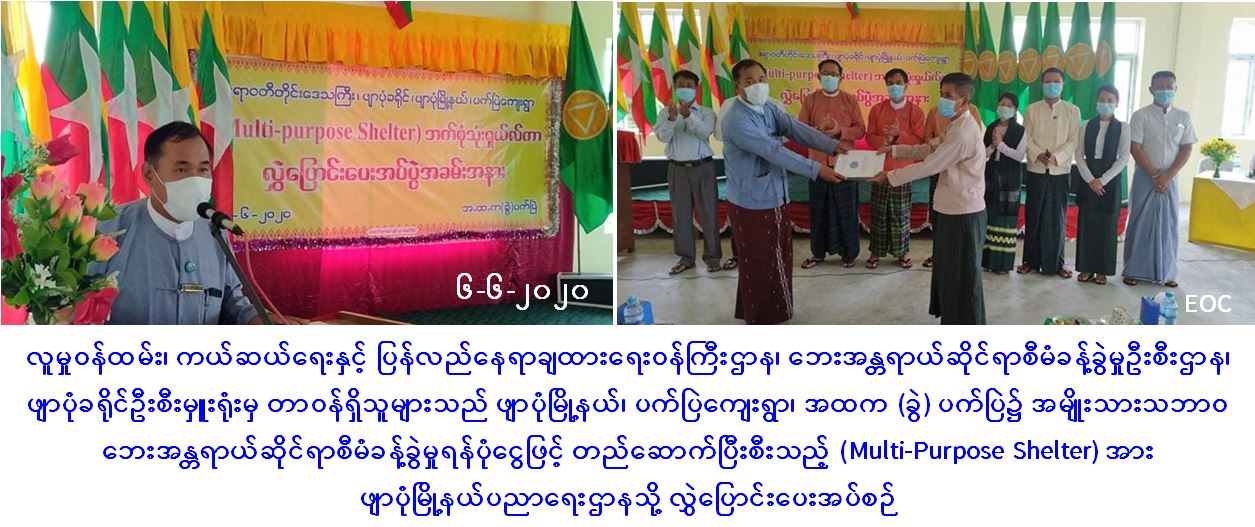လူမှုဝန်ထမ်း၊ ကယ်ဆယ်ရေးနှင့် ပြန်လည်နေရာချထားရေးဝန်ကြီးဌာန၊ ဘေးအန္တရာယ်ဆိုင်ရာစီမံခန့်ခွဲမှုဦးစီးဌာန၊ ဖျာပုံခရိုင်ဦးစီးမှူးရုံးမှ တာဝန်ရှိသူများသည် (၆-၆-၂၀၂၀) ရက်နေ့တွင် ဧရာဝတီတိုင်းဒေသကြီး၊ ဖျာပုံခရိုင်၊ ဖျာပုံမြို့နယ်၊ ပက်ပြဲကျေးရွာ၊ အထက(ခွဲ)ပက်ပြဲ၌ အမျိုးသားသဘာဝဘေးအန္တရာယ်ဆိုင်ရာစီမံခန့်ခွဲမှုရန်ပုံငွေဖြင့်် တည်ဆောက်ပြီးစီးသည့် (Multi-Purpose Shelter) ကို ဖျာပုံမြို့နယ်ပညာရေးမှူးရုံးမှ တာဝန်ရှိသူထံ လွှဲပြောင်းခဲ့ကြောင်း သတင်းရရှိပါသည်။
