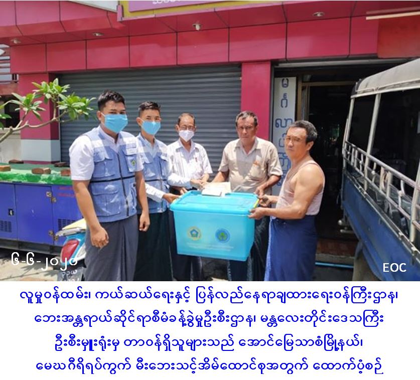 လူမှုဝန်ထမ်း၊ ကယ်ဆယ်ရေးနှင့် ပြန်လည်နေရာချထားရေးဝန်ကြီးဌာန၊ ဘေးအန္တရာယ်ဆိုင်ရာစီမံခန့်ခွဲမှုဦးစီးဌာန၊ မန္တလေးတိုင်းဒေသကြီးဦးစီးမှူးရုံးမှ တာဝန်ရှိသူများသည် အောင်မြေသာစံမြို့နယ်၊ မေဃဂီရိရပ်ကွက်၌ (၅-၆-၂၀၂၀) ရက်နေ့၊ (၁၀:၃၀) နာရီအချိန်တွင် ဖြစ်ပွားခဲ့သော မီးဘေးကြောင့် နံကပ်(၂)ထပ် တစ်စိတ်တစ်ပိုင်းပျက်စီး (၁)အိမ်၊ အိမ်ထောင်စု(၁)စု၊ လူဦးရေ(၄)ဦးတို့အတွက် အိမ်ဆောက်ပစ္စည်းဖိုး(၁၀၀,၀၀၀)ကျပ်၊ ကယ်ဆယ်ရေးပစ္စည်း(၁၀)မျိုးပါ (၁)ပုံးနှင့် ဆန်ရိက္ခာဖိုး(၈,၄၀၀) ကျပ်၊ စုစုပေါင်းထောက်ပံ့ငွေကျပ် (၁၀၈,၄၀၀) ကျပ်တိတိအား (၆-၆-၂၀၂၀) ရက်နေ့၊ (၁၂:၀၀) နာရီအချိန်တွင် သွားရောက်ထောက်ပံ့ခဲ့ကြောင်း သတင်းရရှိပါသည်။