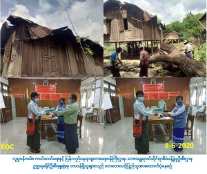 လူမှုဝန်ထမ်း၊ ကယ်ဆယ်ရေးနှင့် ပြန်လည်နေရာချထားရေးဝန်ကြီးဌာန၊ ဘေးအန္တရာယ်ဆိုင်ရာစီမံ ခန့်ခွဲမှုဦးစီးဌာန၊ ဥတ္တရခရိုင်ဦးစီးမှူးရုံးမှ တာဝန်ရှိသူများသည် (၇-၆-၂၀၂၀)ရက်နေ့၊ (၀၆:၁၀)နာရီ အချိန်ခန့်၌ ပြည်ထောင်စုနယ်မြေ၊ နေပြည်တော်၊ ဥတ္တရခရိုင်၊ တပ်ကုန်းမြို့နယ်၊ လယ်ဇပင် ကျေးရွာအုပ်စု၊ ဖက်သန်းတောင်ကျေးရွာတွင် ဖြစ်ပွားခဲ့သော လေဘေးကြောင့် အမိုးလန် ပျက်စီးဆုံးရှုံးခဲ့သည့် နေအိမ် (၁) လုံးအတွက် အိမ်ဆောက်ပစ္စည်းဖိုးထောက်ပံ့ငွေ (၄၂,၅၀ဝိ/-) ကျပ်၊ ဘေးသင့်လူဦးရေ(၁)ဦးအတွက် ဆန်ရိက္ခာဖိုးထောက်ပံ့ငွေ(၂,၁၀ဝိ/-) ကျပ်၊ စုစုပေါင်း ထောက်ပံ့ငွေ(၄၄,၆၀ဝိ/-) ကျပ်အား (၈-၆-၂၀၂၀)ရက်နေ့၊ (၁၃:၃၀)နာရီအချိန်တွင် ဘေးသင့်ပြည်သူများ လက်ဝယ်သို့သွားရောက်ထောက်ပံ့ခဲ့ကြောင်း သတင်းရရှိပါသည်။